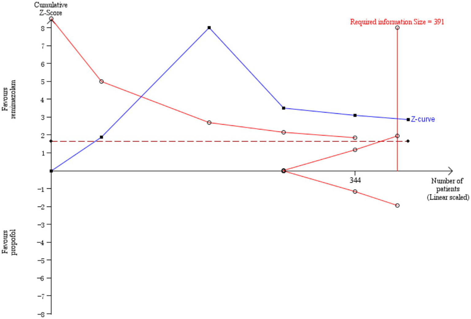 Five studies involving 404 elderly patients (13–16, 20) compared the incidence of hypotension between remimazolam and propofol (remimazolam group, N = 202; propofol group, N = 252). Heterogeneity testing showed low heterogeneity (I2 = 38%, p = 0.17), suggesting that the included studies were relatively homogeneous. A random-effects model was used, yielding a relative risk (RR) of 0.56 (95% CI: [0.31, 1.02], Z = 1.88, p = 0.06), meaning the incidence of hypotension in the remimazolam group was only 58% of that in the propofol group, which was statistically significant. This suggests that remimazolam may reduce the incidence of hypotension during general anesthesia in elderly patients compared to propofol. To explore the sources of heterogeneity, a sensitivity analysis was performed. We found that the study by Xu, Q, and colleagues contributed significant heterogeneity compared to the other studies. After removing this study, heterogeneity decreased significantly (I2 = 0%, p = 0.5), but the result was no longer statistically significant (RR = 0.72, 95% CI: [0.49, 1.07], Z = 1.62, p = 0.1). The trial sequential analysis (TSA) of the hypotension incidence crossed the monitoring boundaries but did not reach the required information size (power = 90%). Therefore, the result may be a false positive, and further trials are needed to validate the findings (Figure 12).