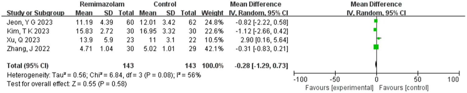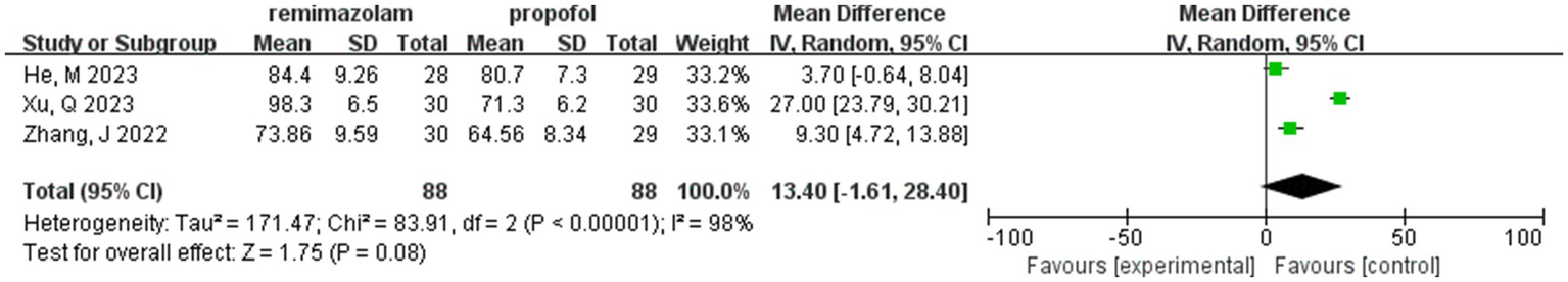 Four studies involving 202 elderly patients (16–18, 20) compared the time to loss of consciousness between the remimazolam group (N = 101) and the propofol group (N = 101). A heterogeneity test (I2 = 73%, p = 0.01 < 0.1) indicated significant heterogeneity among the selected studies. A random-effects model was used, yielding a WMD of 29.83 (95% CI: [22.83, 37.47], Z = 9.74, p < 0.00001). These results suggest that the time to loss of consciousness in the remimazolam group was 29.83 s longer than in the propofol group, a statistically significant difference. This implies that in elderly patients undergoing general anesthesia, remimazolam requires more time to induce loss of consciousness compared to propofol (Figure 15).