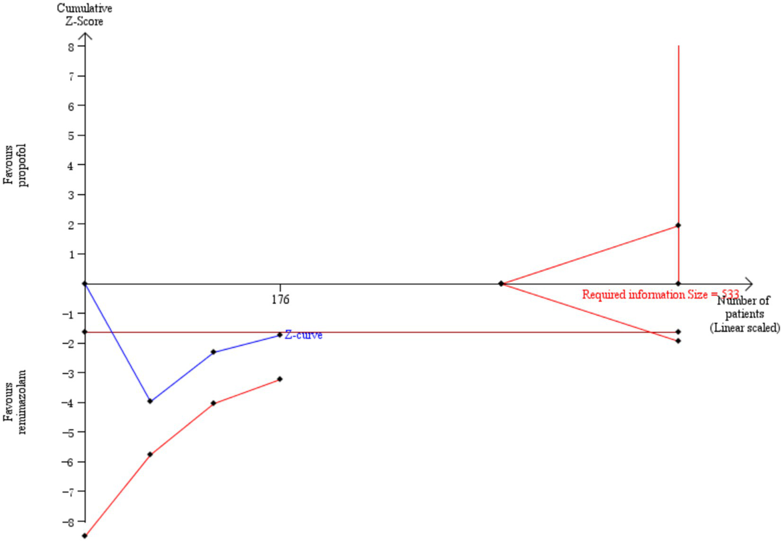 In recent years, several clinical studies have compared the incidence of adverse events such as hypoxemia, nausea, and vomiting in this context. However, the reporting of these outcomes has been inconsistent. For example, Doi, M. and colleagues compared the efficacy and safety of remimazolam and propofol for general anesthesia. Overall, the proportion of patients experiencing adverse drug reactions was higher in the propofol group (61.3%) than in the remimazolam group (41.0%). However, the frequency of nausea (7%) and vomiting (6%) was slightly higher in the remimazolam group compared to the propofol group (5.3 and 4.0%, respectively) (24). However, our meta-analysis did not find significant differences in the incidence of hypoxemia and nausea/vomiting between the two sedatives. We further performed a Trial Sequential Analysis (TSA) on these adverse events, but due to limited information, no conclusive results were obtained. This may be because the included studies involved heterogeneous patient populations, whereas our analysis focused exclusively on elderly patients. Another potential reason is the insufficient sample size in the included studies. We will continue to monitor research developments and update the meta-analysis results accordingly.