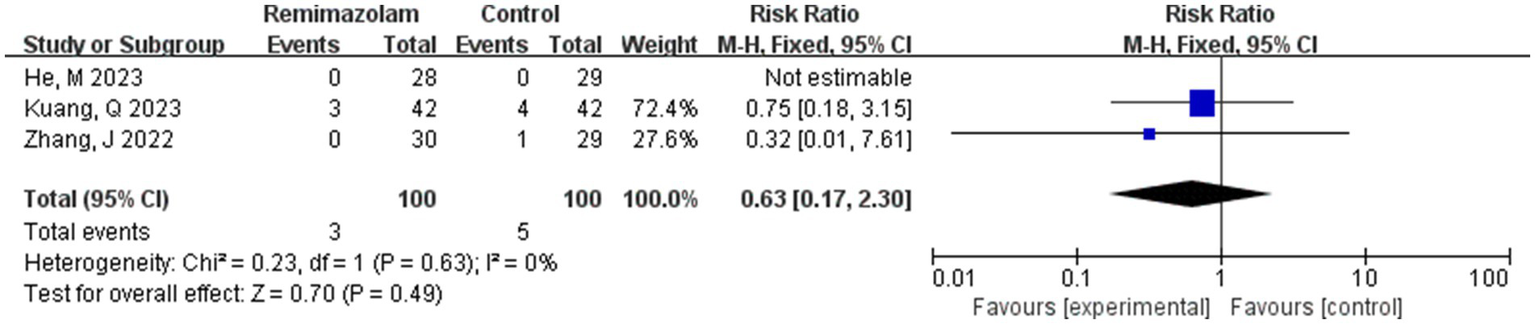 Three studies involving 200 elderly patients (14, 19, 20) compared the incidence of hypoxemia between the remimazolam group (N = 100) and the propofol group (N = 100). A heterogeneity test (I2 = 0% < 50%, p = 0.63 > 0.1) indicated no heterogeneity among the selected studies. Using a fixed-effects model, the results showed an RR of 0.63 (95% CI: [0.17, 2.30], Z = 0.70, p = 0.49 > 0.05, Figure 14), suggesting that the incidence of nausea and vomiting in the remimazolam group was 63% of that in the propofol group. However, this result was not statistically significant.
