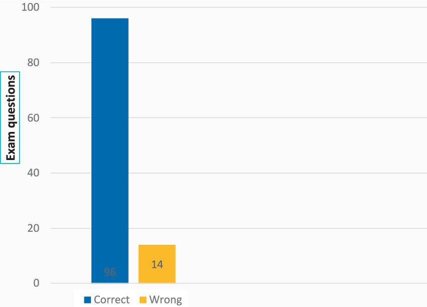 GPT-4’s responses to 110 exam questions. Accuracy Rate: GPT-4 answered 96 out of 110 questions correctly, which yielded an accuracy rate of approximately 87.27% (96/110 × 100). Error Rate: GPT-4 gave 14 incorrect answers, which resulted in an error rate of approximately 12.73% (14/110 × 100).
