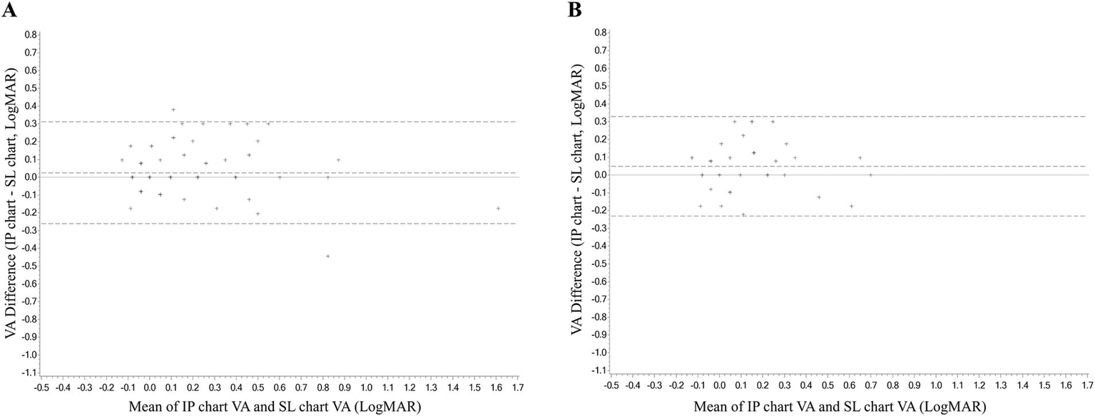 Data analysis was performed using visual acuities determined with the automatic visual acuity chart projector and the logarithmic visual acuity chart was converted to a logarithm of the minimal angle of resolution (logMAR). The repeatability of the IP chart was evaluated by ICC analyses. The consistency between the IP chart and SL chart was evaluated by ICC and Bland–Altman statistical analyses. The ICC was calculated using IBM SPSS Statistics V.26.0 (IBM). The Bland–Altman statistical analyses were performed using SAS JMP V.15.1 (SAS Institute).