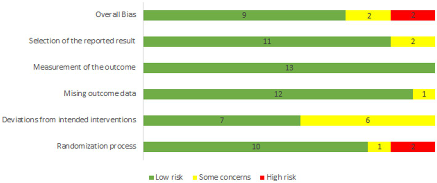 The assessment revealed a mixed level of bias across the studies. Notably, a few studies were judged to have a high risk of bias in several categories, particularly in the measurement of outcomes and selection of reported results. Conversely, several studies were rated with low risk in areas like randomization process and deviations from intended interventions (Figure 2; Supplementary Figure S1).