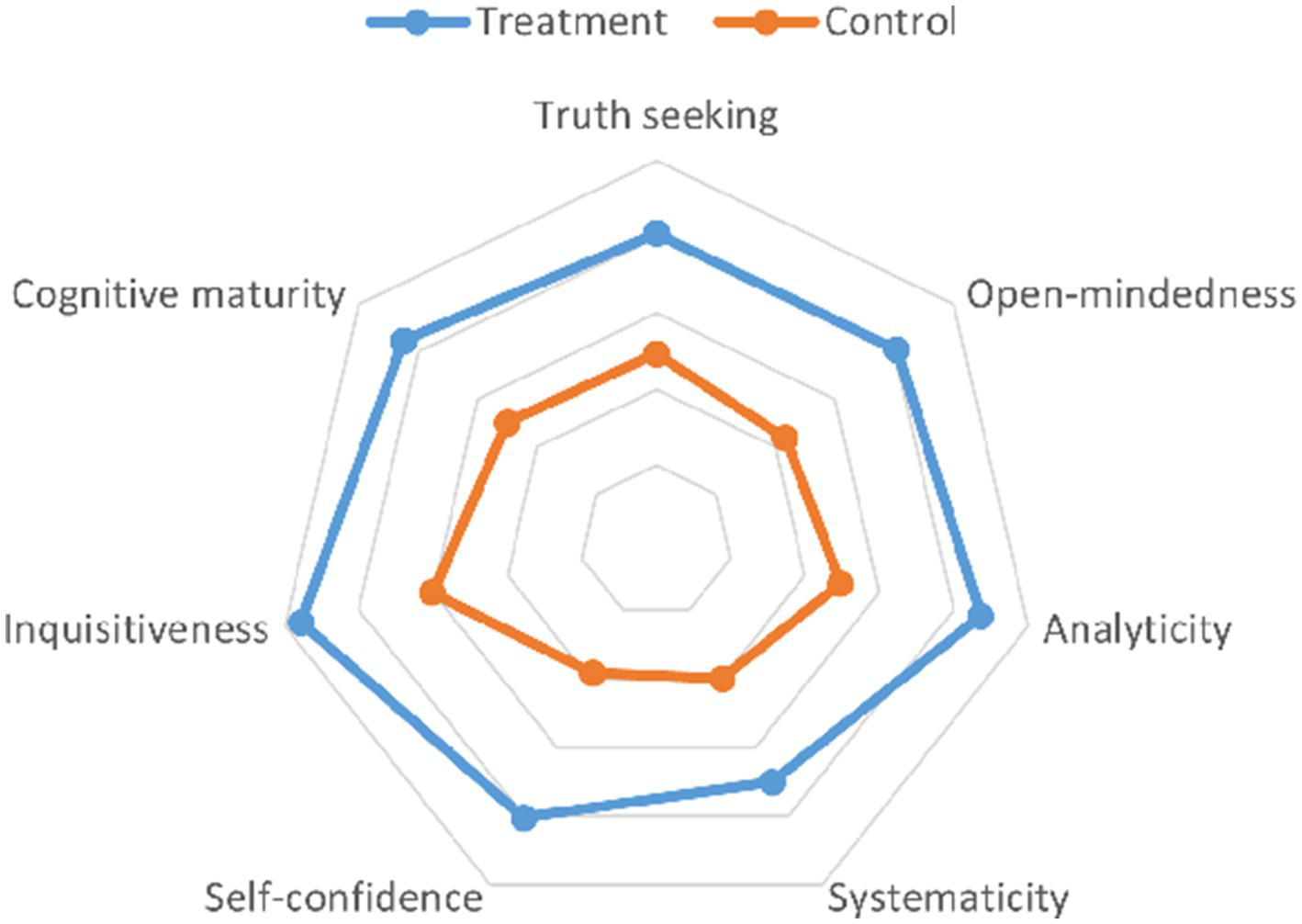 Employing a random-effects model due to substantial heterogeneity (I2 = 99.03%, tau2 = 188.42), the analysis revealed a significant overall mean difference (MD) in critical thinking scores of 26.39 (95% CI 18.71 to 34.06). Individual study contributions varied, with MD ranging from a low of 3.13 to a high of 57.20, reflecting the diverse impact of CBL across different educational settings and study designs. The significant test of overall effect (z = 6.74, p < 0.01) confirmed the efficacy of CBL in enhancing critical thinking dispositions, despite the observed high heterogeneity among the studies included (I2 = 99.03%) (Figure 3). Figure 4 visually represented the comparative analysis, with each vertex corresponding to a different dimension of critical thinking: truth seeking, open-mindedness, analyticity, systematicity, self-confidence, inquisitiveness, and cognitive maturity.