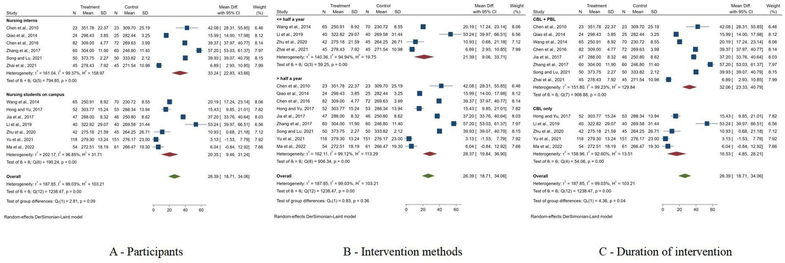 The Subgroup analysis revealed that nursing interns experienced a higher improvement (MD = 33.24, 95% CI: 22.83 to 43.66) compared to on-campus nusring students (MD = 20.35, 95% CI: 9.46 to 32.24), although the heterogeneity within these subgroups remained high. When comparing intervention methods, studies incorporating both CBL + PBL showed a higher effect (MD = 32.06, 95% CI: 23.33 to 40.79) than those with CBL only (MD = 16.53, 95% CI: 4.85 to 28.21), with the difference between groups being statistically significant (p < 0.05). Furthermore, interventions lasting longer than half a year yielded a slightly higher effect (MD = 28.37, 95% CI: 19.84 to 36.90) compared to shorter durations (MD = 21.39, 95% CI: 9.06 to 33.71), although this was not statistically significant (p = 0.36) (Figure 5).