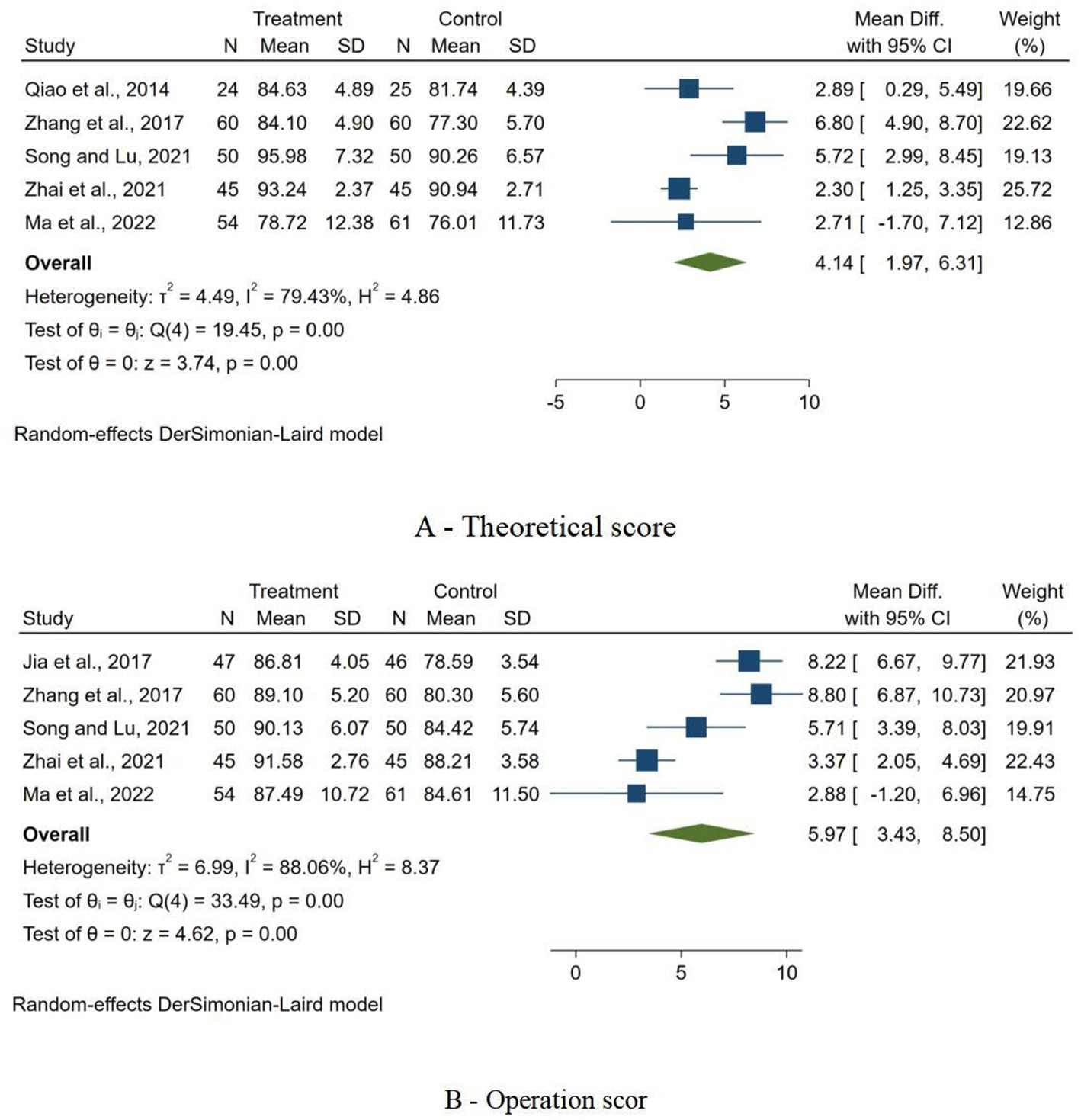 Forest plots of secondary outcome. (A) Forest plot of the impact of interventions on theoretical scores; (B) Forest plot of the impact of interventions on operation score.