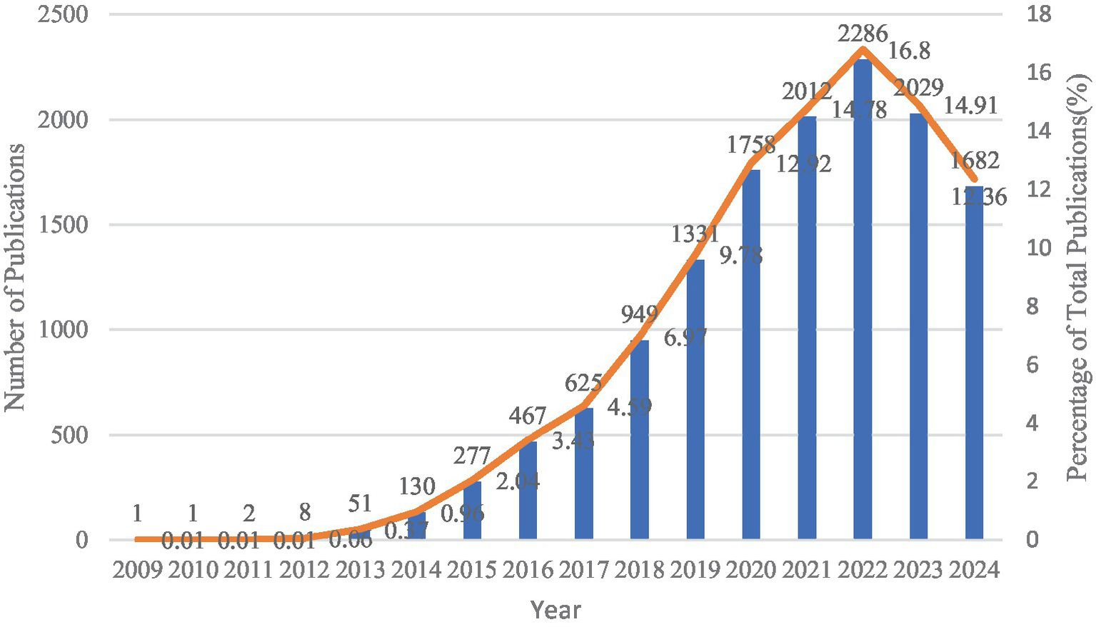 We excluded non-English articles, duplicate literature, letters, meeting abstracts, news items, editorials, comments, and retracted publications. There were no restrictions on publication date. Figure 1 illustrates the process and results of literature screening. A total of 13,609 documents were included in the analytic sample.