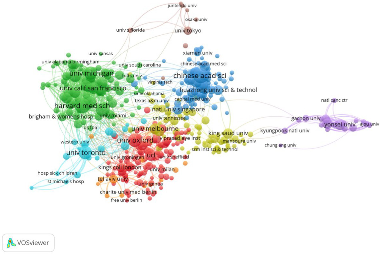 Of the 13,959 institutions involved in research on big data analytics in medicine, 1,436 had published more than 5 papers. Table 2 presents the publications of the top 10 institutions over the last 15 years. Harvard Medical School (211 articles), the Chinese Academy of Sciences (209 articles), and Stanford University (169 articles) were the top three institutions in terms of published articles. The interinstitutional cooperation network map for institutions with 15 or more publications was generated using VOSviewer software (Figure 4). The leading institutions by TLS were Harvard Medical School (755), the University of Toronto (602), and the University of California, San Francisco (499).
