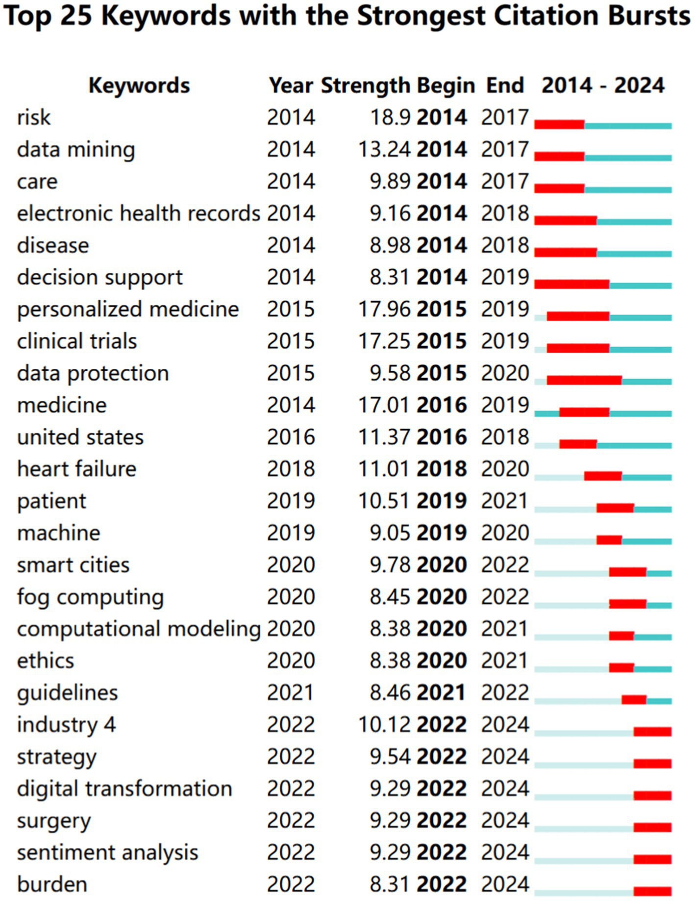 A total of 613,873 references were found, of which 1,153 were cited more than 20 times. We displayed the top 10 articles with the highest number of citations. The top co-cited reference is by Raghupathi W. with 440 citations, followed by Murdoch T. B. with 342 citations, and Obermeyer Z. with 323 citations (Supplementary Table S3). As shown in Supplementary Figure S5, the 25 references with the greatest number of citation bursts date back to 2014. Significantly, seven citations remain in burst mode even today.