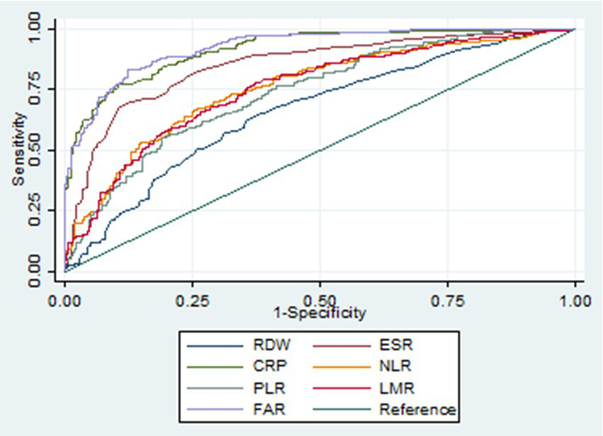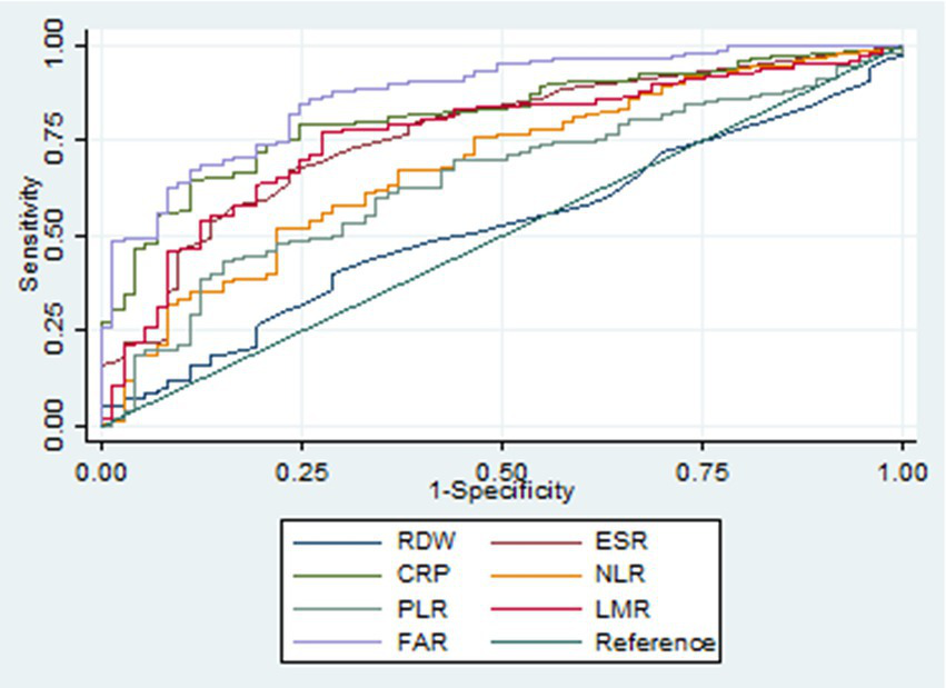 Figure 2. Receiver operating characteristic curves of various biomarkers in identifying active Crohn’s disease. RDW, red cell distribution width; ESR, erythrocyte sedimentation rate; CRP, C-reactive protein; NLR, neutrophil-to-lymphocyte ratio; PLR, platelet-to-lymphocyte ratio; LMR, lymphocyte-to-monocyte ratio; FAR, fibrinogen-to-albumin ratio.
