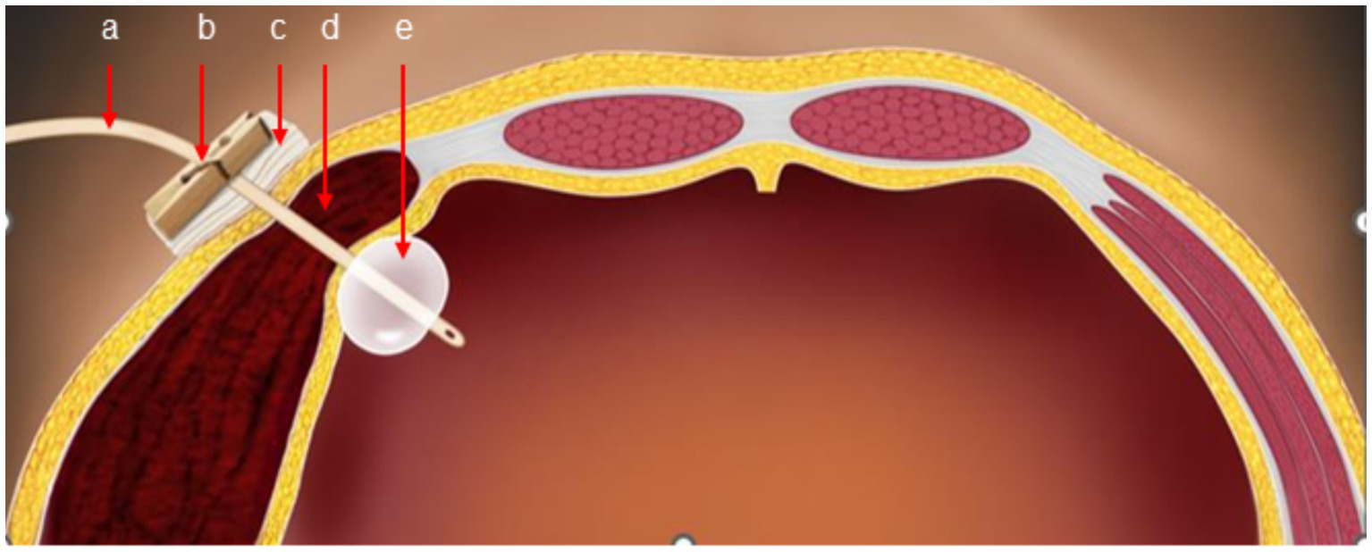 Figure 2. Schematic diagram of catheter balloon compression (a: urinary catheter, b: clamp, c: gauze, d: hematoma, e: catheter balloon).