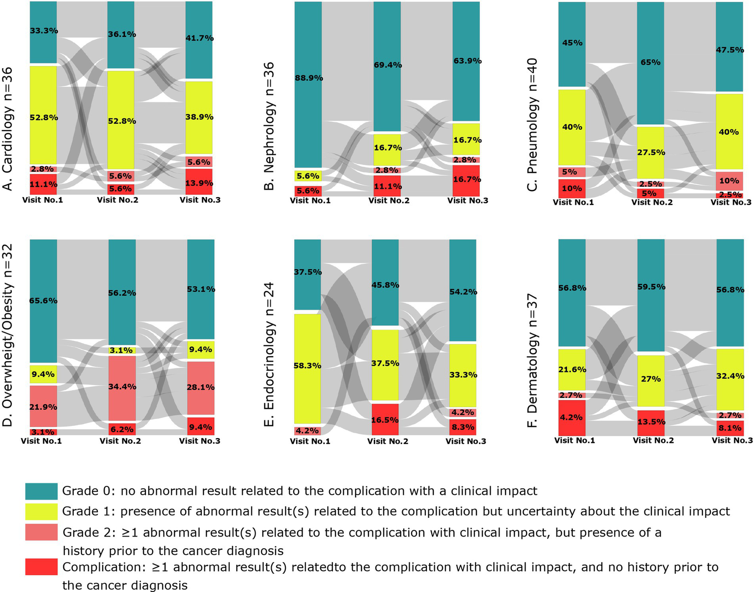 A linear mixed model for repeated measures was used to evaluate the relationship of the follow-up (visit number) on HRQoL score, fatigue FSS score and 6 minute walk distance (6MWD). The visit number was considered as a continuous variable. The following assumptions were evaluated: relationship between residuals and distribution of residuals. The best fitted model was selected based on likelihood ratio test. Sankey plots were constructed to graphically represent the proportions of patients graded for complications at each of the three visits, as well as the flow of patients changing grades between visits. For each complication, patients with incomplete data availability at all three visits were excluded from the analyses.