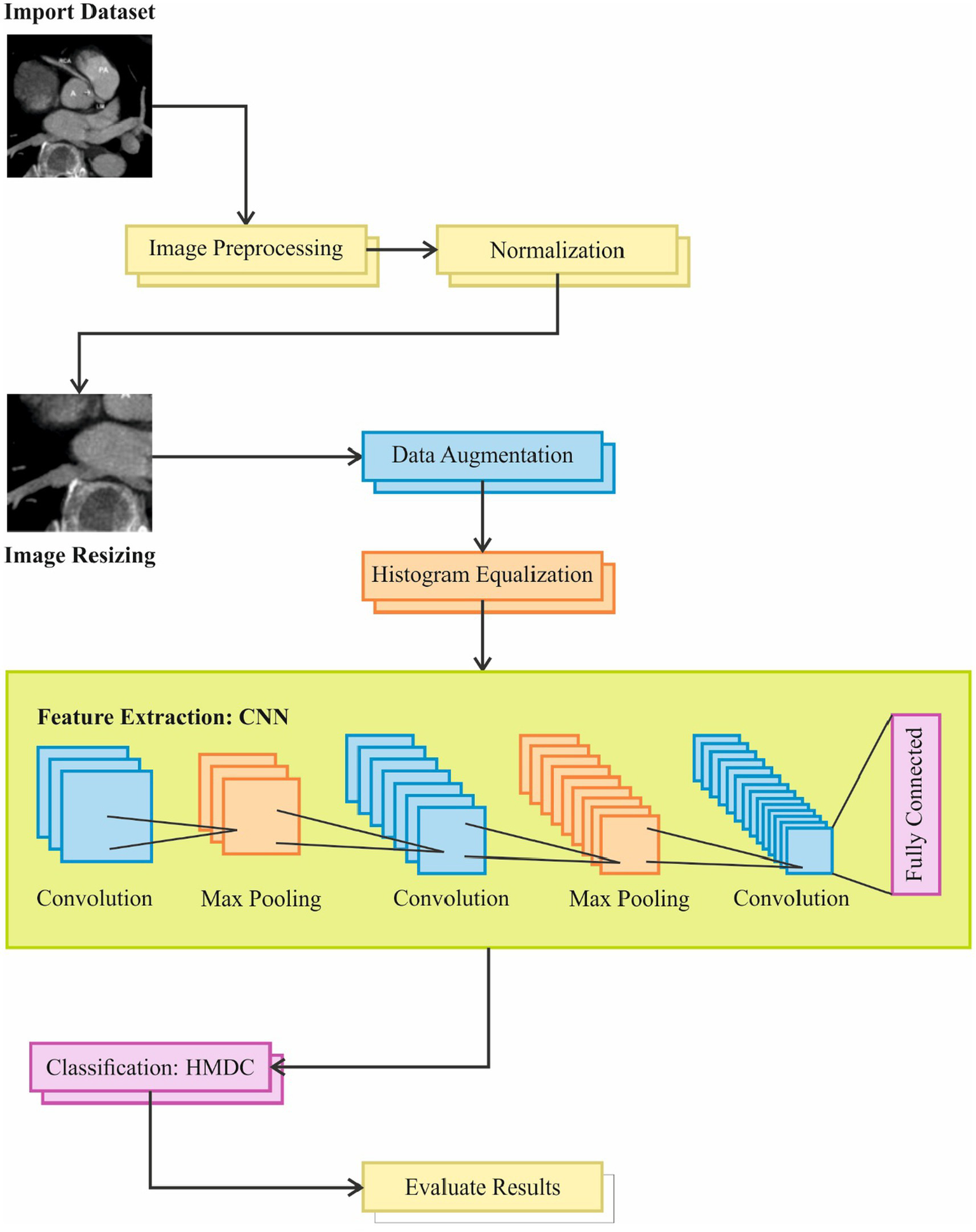 Overview of the image processing pipeline used in the study, including steps such as dataset import, image resizing, preprocessing, and normalization. The pipeline incorporates feature extraction using CNN, data augmentation, convolution with max pooling, and classification through HMDC, followed by evaluation of results and fully connected layers for final output.