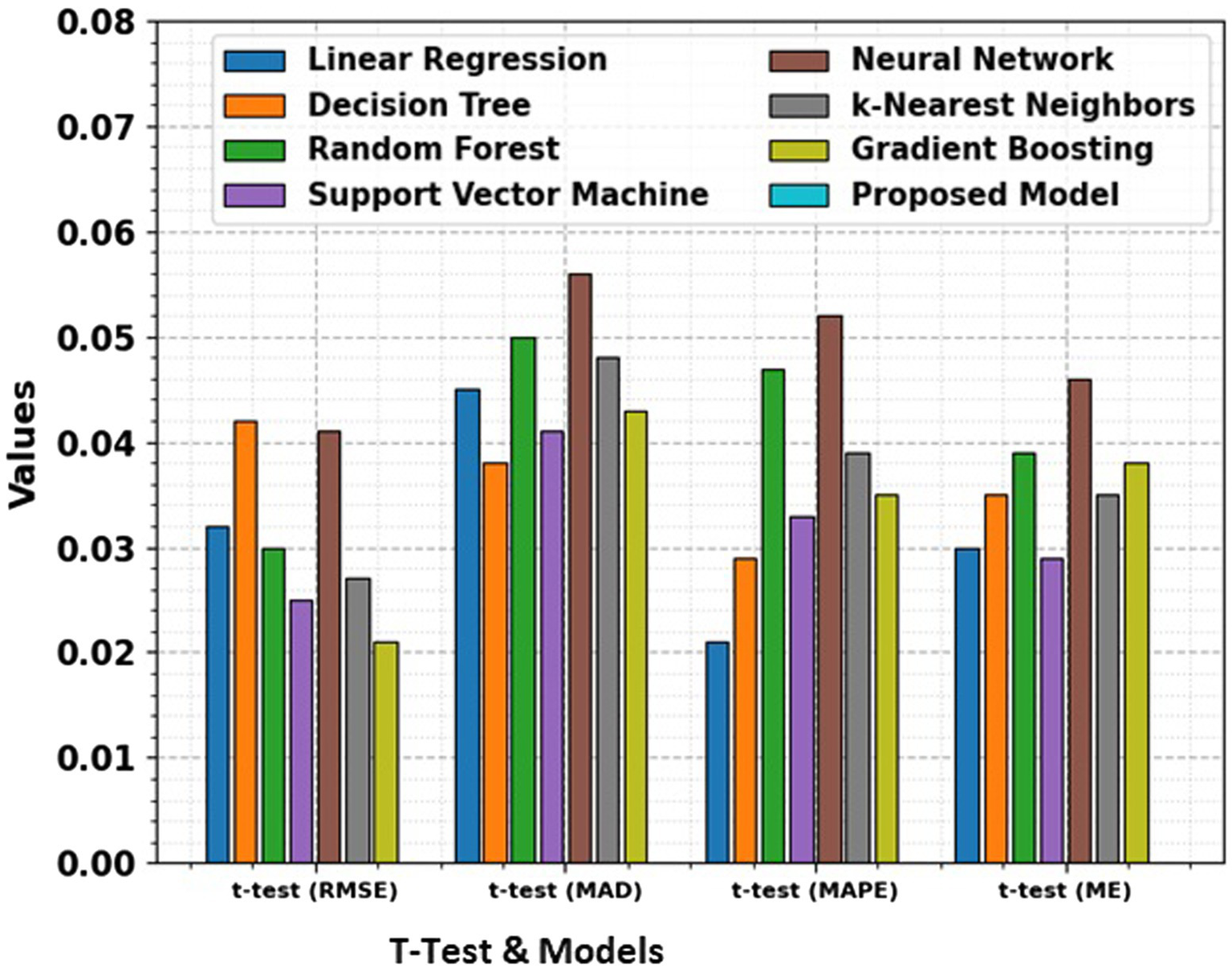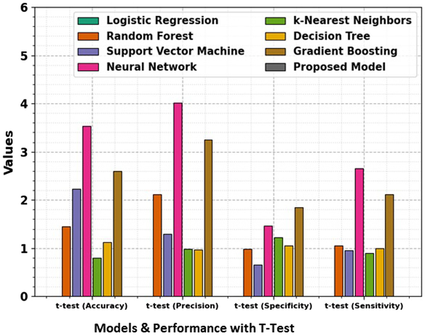 The t-test values in the table indicate the statistical significance of the differences between the performance metrics namely Accuracy, Precision, Specificity, and Sensitivity of the proposed model and the other models. Each t-test value compares a specific model’s metric to the proposed model’s corresponding metric. A higher t-test value suggests a more significant difference between the performance of the model, indicating that the proposed model may outperform or underperform compared to the others in that metric. These values help to evaluate the reliability of the observed differences and provide insights into the comparative efficiency of the models. The absence of t-test values for the proposed model means it is the baseline against which the other models are compared.