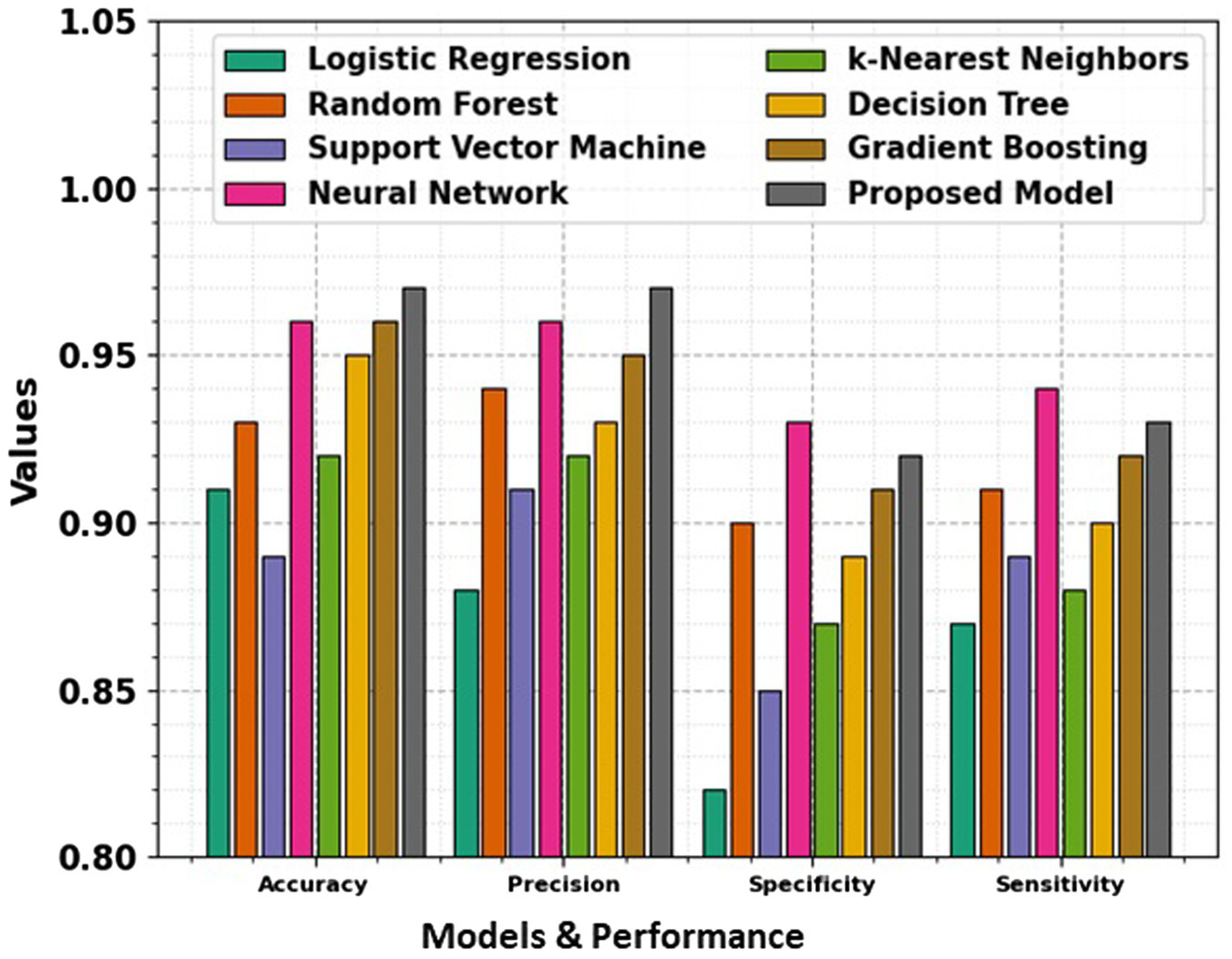 k-Nearest Neighbors (k-NN) achieves an accuracy of 92%, demonstrating its efficiency in correctly classifying instances. The precision of 92% highlights its precision in positive predictions, while the specificity of 87% reflects its accuracy in negative predictions. The sensitivity of 88% underscores k-NN’s capability in correctly identifying true positive instances. Decision Tree attains an accuracy of 95%, showcasing its efficacy in correct classifications. The precision of 93% emphasizes its precision in positive predictions, while the specificity of 89% reflects its accuracy in negative predictions. With a sensitivity of 90%, Decision Tree excels in correctly identifying true positive instances. Gradient Boosting, a sequential ensemble technique, achieves an accuracy of 96%, outperforming several other models. The precision of 95% showcases its precision in positive predictions, while the specificity of 91% reflects its accuracy in negative predictions. The sensitivity of 92% underscores Gradient Boosting’s effectiveness in correctly identifying true positive instances. The Proposed Model emerges as the top performer with an impressive accuracy of 97%, demonstrating its exceptional discriminatory power. The precision of 97% emphasizes the model’s precision in positive predictions, while the specificity of 92% reflects its accuracy in negative predictions. With a sensitivity of 93%, the Proposed Model excels in correctly identifying actual positive instances. This comprehensive evaluation provides valuable insights into the strengths and capabilities of diverse classification models. Each model exhibits unique advantages, and the top-performing Proposed Model stands as a testament to the continual advancements in algorithmic development. The significance of precision, specificity, sensitivity, and accuracy in classification underscores these metrics’ critical role in assessing the reliability and effectiveness of machine learning models. Pursuing more accurate and robust classifiers as the field evolves remains a dynamic and ongoing endeavor.