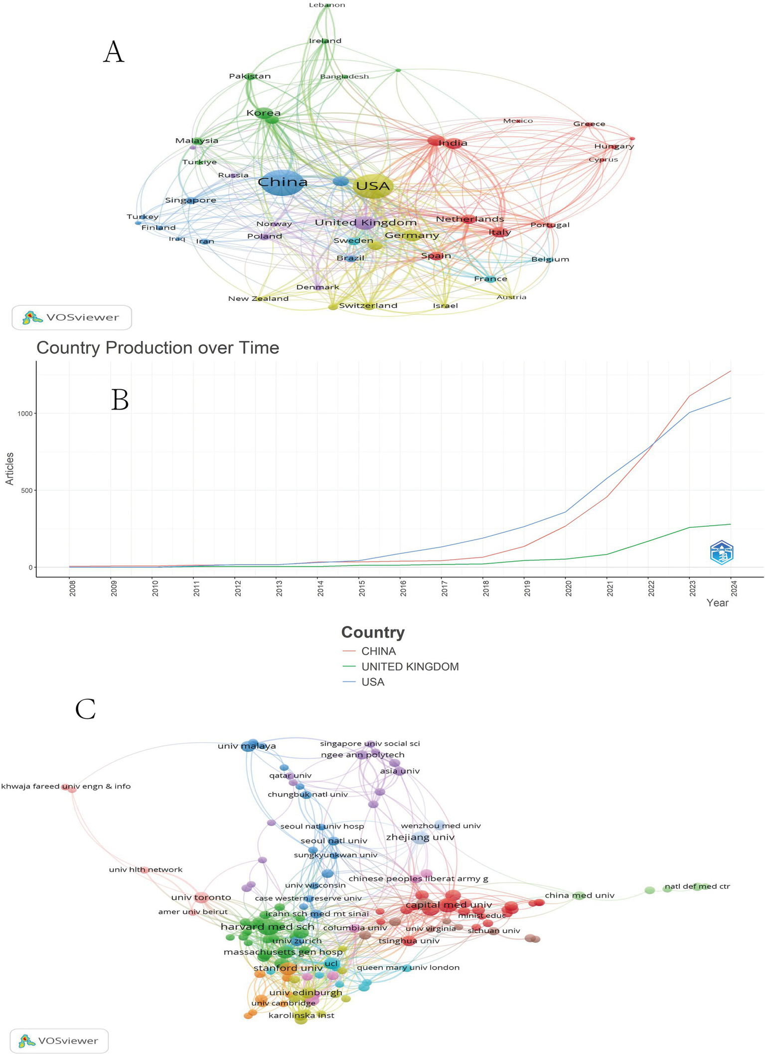 VOSviewer software was utilized to create the national collaboration network diagram (Figure 2A), while Bibliometrix software was employed to generate the country production diagram showcasing the top three countries in terms of publication volume (Figure 2B). In Figure 2A, countries are represented by circles, with larger circles indicating a higher publication volume. The connecting lines signify collaborations between countries, and distinct clusters are represented by different colors. The analysis of national collaboration reveals the emergence of clusters in the fields of ML and MI, with China and the United States as prominent representatives. China primarily collaborates with Asian and European countries such as Japan, South Korea, the United Kingdom, and Germany, whereas the United States mainly collaborates with Asian and European countries, including the United Kingdom, Germany, and India. Analysis of spatiotemporal development indicates that before 2015, there was a comparable level of research output among countries in MI and ML research. However, after 2015, both China and the United States experienced rapid development (a significant increase in research output and quality over a short period) in this field, starting from 2022, China’s research in this area will surpass that of the United States (Figure 2B).