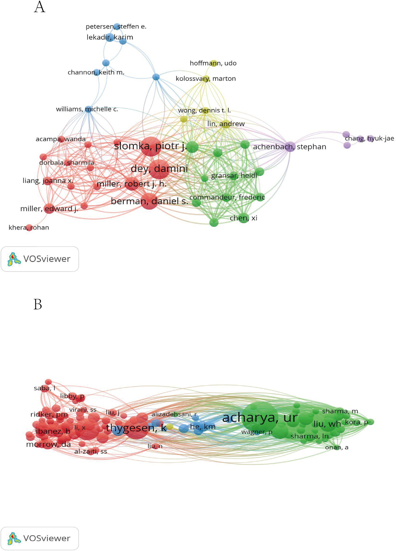 MI and ML author collaboration diagram (A). MI and ML cited author collaboration chart (B).