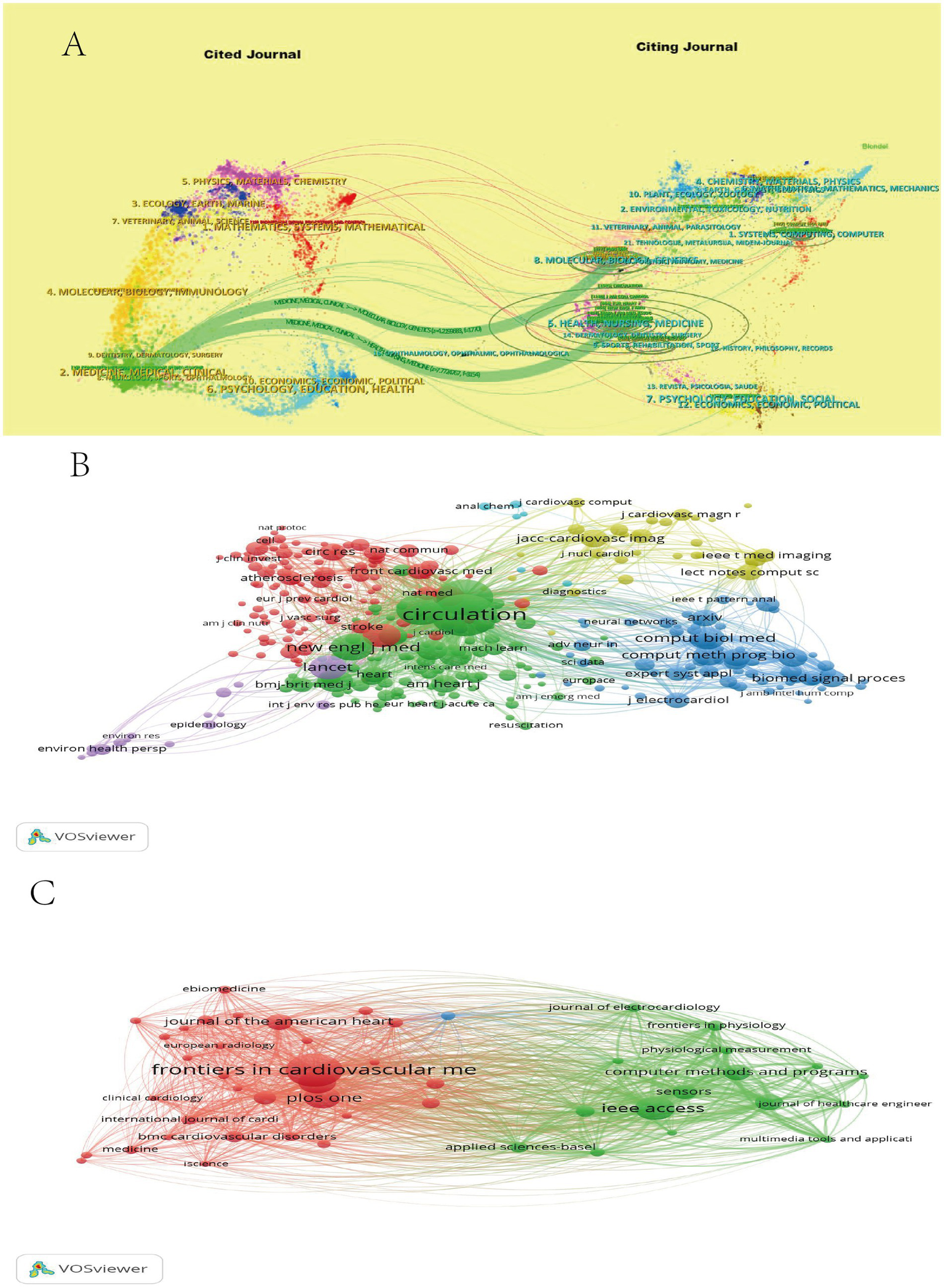 Periodicals double-map superposition of MI and ML journals (A). Co-occurrence map of cited journals in MI and ML (B). Journal Collaboration Map for MI and ML (C).