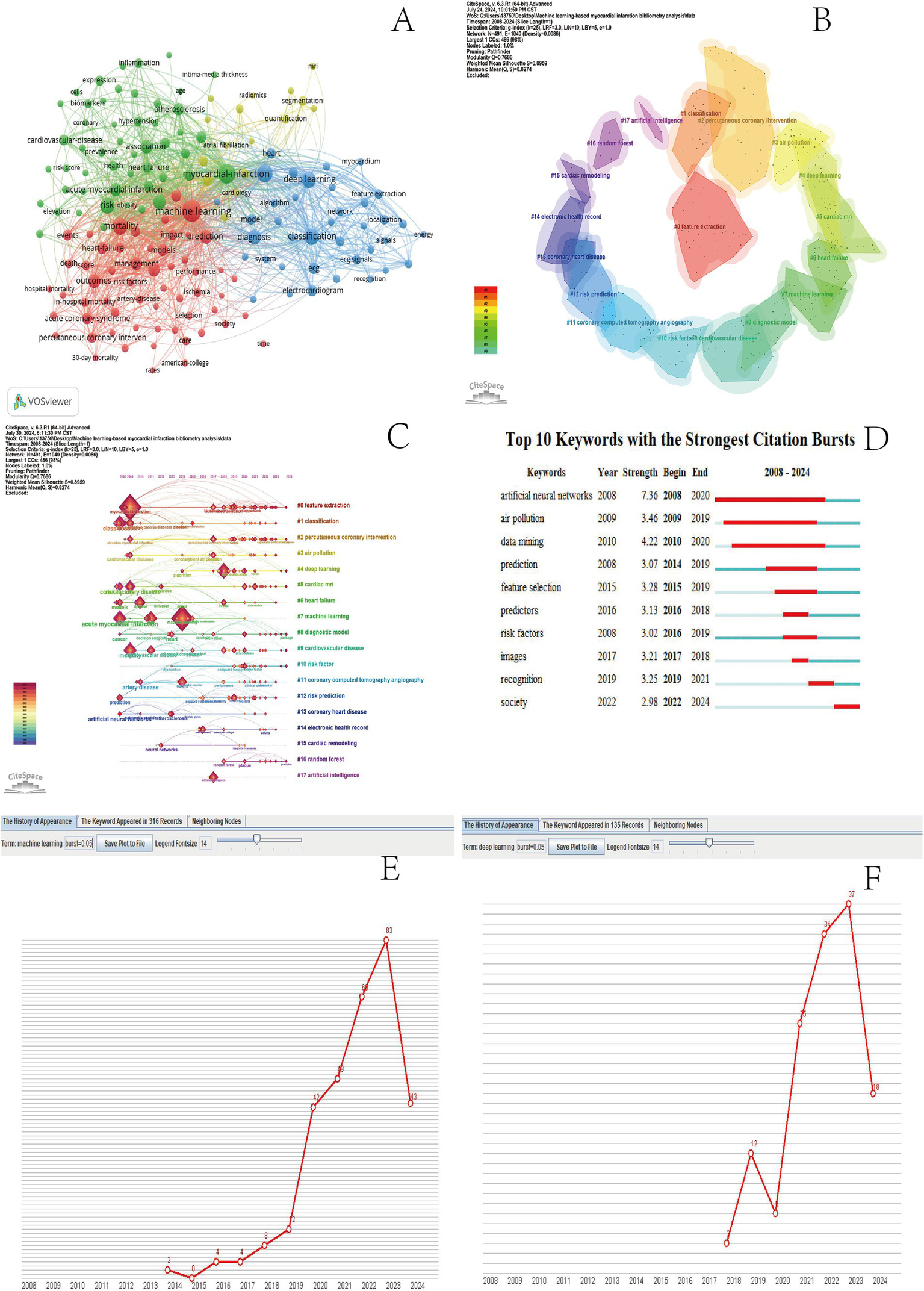 MI and ML keyword co-occurrence chart (A). MI and ML keyword clustering plots (B). ML and MI keywords timeline (C). MI and ML Top 20 Burst keywords (D). Machine learning timeline (E). Deep Learning Timeline (F).