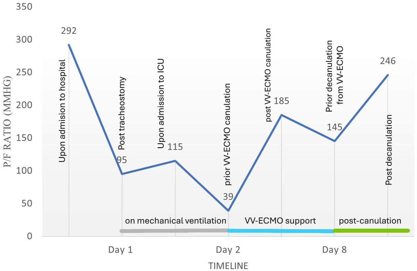 The FiO₂ values shown in the table are taken from the settings of the invasive mechanical ventilators. The bold values presented in Table 1 highlight key clinical turning points, including marked deterioration prior to mechanical ventilation, severe hypoxemia before VV-ECMO cannulation, and a subsequent rapid improvement in respiratory parameters during and after VV-ECMO therapy—supporting its role as an effective bridge to recovery.