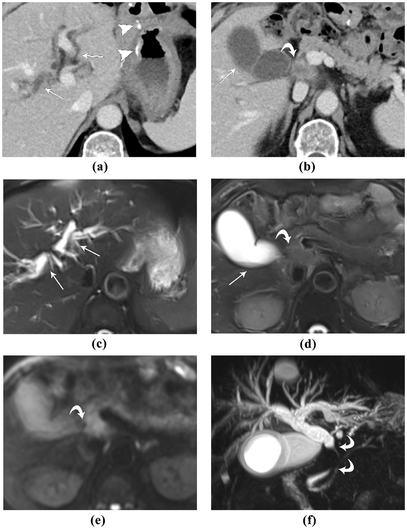 In 18 patients with MRI/MRCP, lesions involving the intra-pancreatic segment of the common bile duct were observed in 12 (66.7%) cases, while 4 (22.2%) cases with lesions involving the extra-pancreatic segment of the common bile duct. MRI/MRCP detected masses in 12 (66.7%) patients, including 6 (33.3%) intra-pancreatic masses, 2 (11.1%) intra-hepatic masses, 2 (11.1%) extra-pancreatic/extra-hepatic bile duct masses, 3 (16.7%) hilar masses, and 2 (11.1%) masses at surgical anastomoses. Multiple abdominal masses were found in 3 (16.7%) cases. Two cases of biliary strictures (11.1%) and 2 (11.1%) cases of bile duct wall thickening were observed. A total of 7 (50.0%) patients had lymphadenopathy, including 5 (35.7%) and 2 (11.1%) cases with abdominal lymph node enlargement and retroperitoneal lymph node enlargement, respectively; 1 (5.5%) case exhibited both abdominal and retroperitoneal lymph node enlargement. Additionally, 1 (5.5%) patient had ascites and 1 (5.5%) had peritoneal implants detected on MRI. Two cases of bile duct stones (11.1%) and 1 (5.5%) case of pancreatic diffuse enlargement were ob-served exclusively in patients with benign obstructive jaundice.