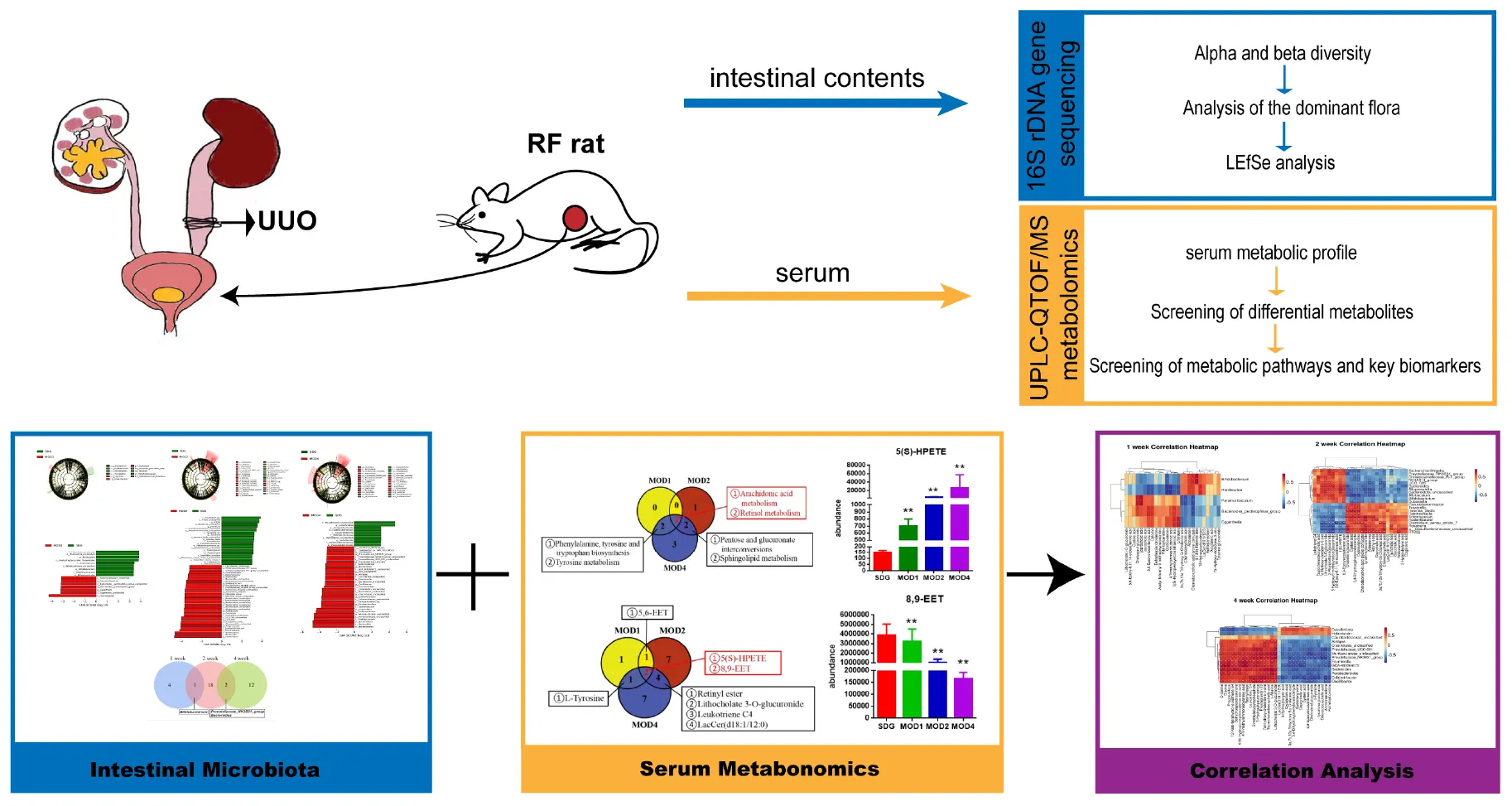 We identified 5, 21, and 14 potential gut microbial markers and 19, 23, and 31 potential metabolic markers in the MOD1, MOD2, and MOD4 groups, respectively. Bifidobacterium was identified as a shared microbial marker between the MOD1 and MOD2 groups; Prevotellaceae_NK3B31_group and Bacteroides were identified as shared microbial markers between the MOD2 and MOD4 groups. The pathways of arachidonic acid metabolism and retinol metabolism were found to play a significant role in the modulation of renal fibrosis at 1, 2, and 4 weeks. Notably, the metabolic biomarkers 8,9-EET and 5(S)-HPETE within these pathways emerged as critical determinants influencing renal fibrosis.