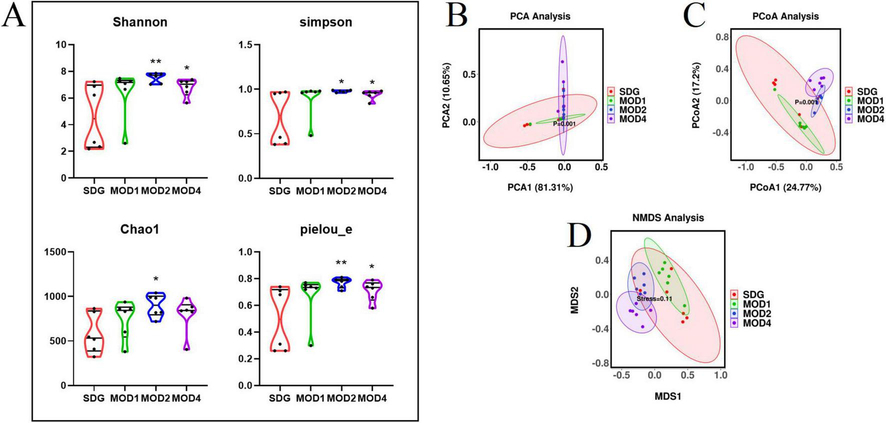 Analysis of bacterial diversity in RF. (A) Alpha diversity analysis, including Shannon index, Simpson index, Chao1 index and Pielou_e index. *p < 0.05 and **p < 0.01 vs. SDG group. (B) Beta diversity analysis was conducted within each group: (C) PCA; PCoA; (D) NMDS analysis.