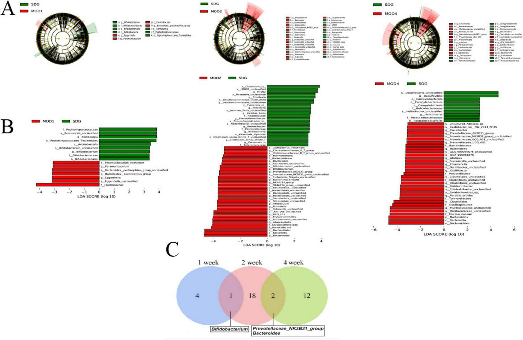 (A) LEfSe analysis and histogram of (B) LDA value distribution were performed on RF rats in each group. (C) A Venn plot was used to display the common differential bacterial biomarkers of RF at 1, 2, and 4 weeks (n = 6). LDA value > 3 and p < 0.05.