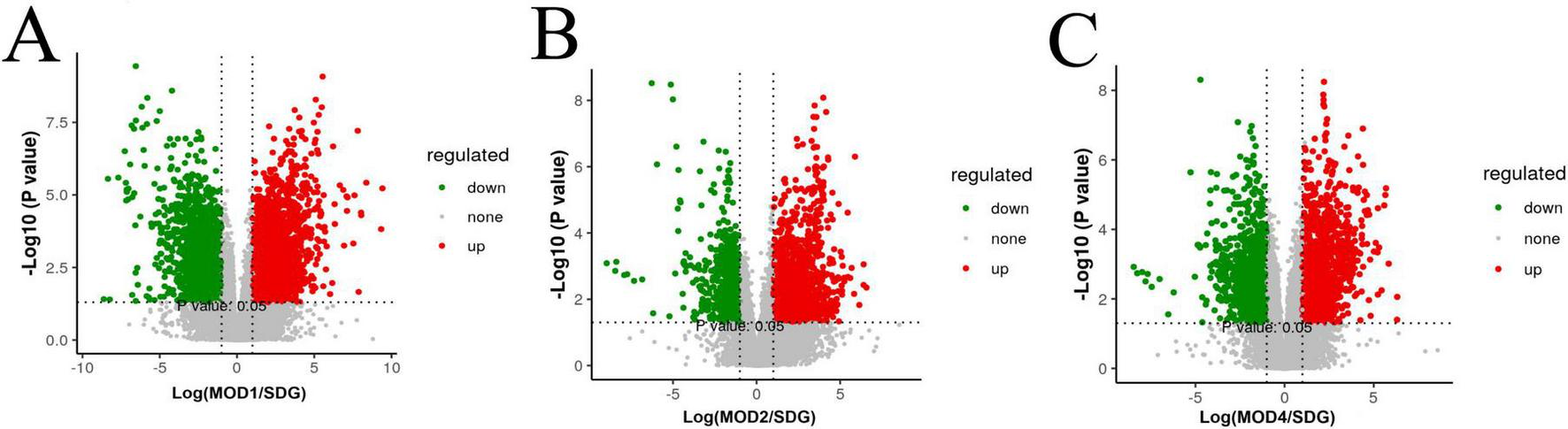 Metabolomics volcano plots of SDG vs. RF models at different stages (MOD1, MOD2, MOD4). (A) SDG vs. MOD1, (B) SDG vs. MOD2, (C) SDG vs. MOD4. Red/green dots indicate significantly up/downregulated metabolites (| log2FC| > 1.5, p < 0.05). Dashed lines mark thresholds.