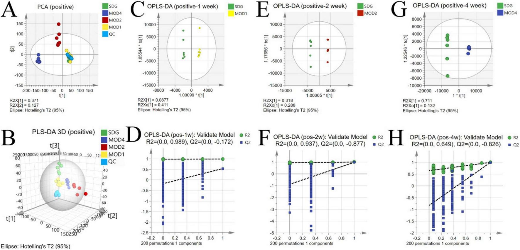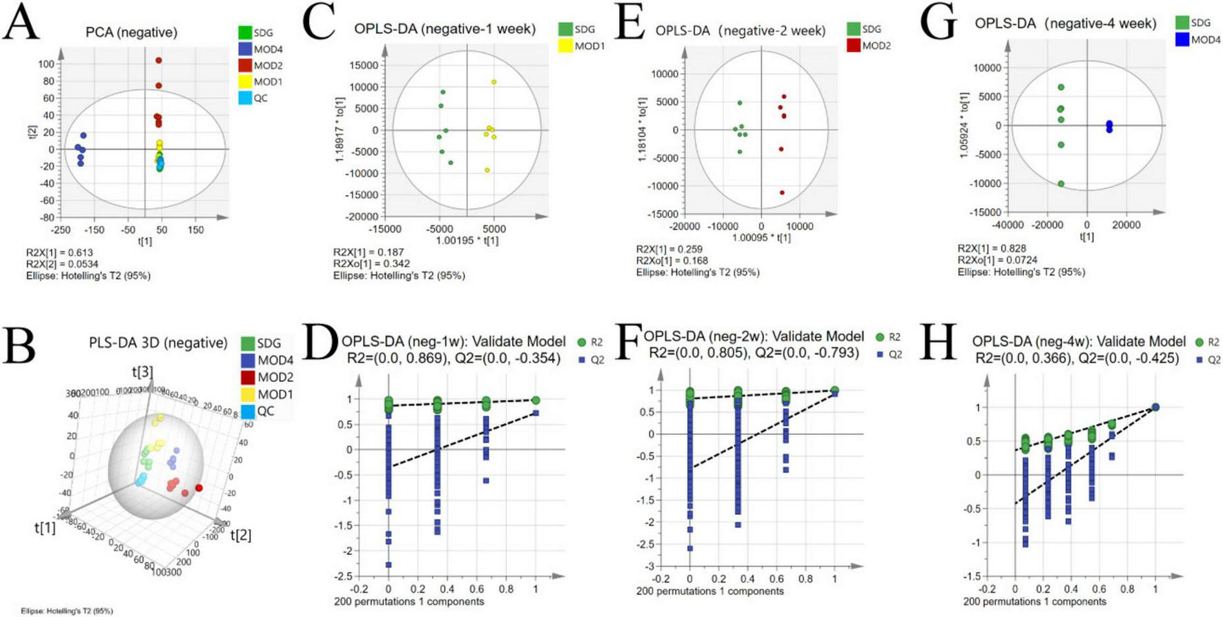 Alterations in the serum metabolic profile during RF under negative ion mode. PCA score plot (A); 3D PLS-DA score plot (B) (R2X = 0.713, R2Y = 0.924, Q2 = 0.833); OPLS-DA score plot: MOD1 (C), MOD2 (E), MOD4 (G); model validation: MOD1 (D), MOD2 (F), MOD4 (H).