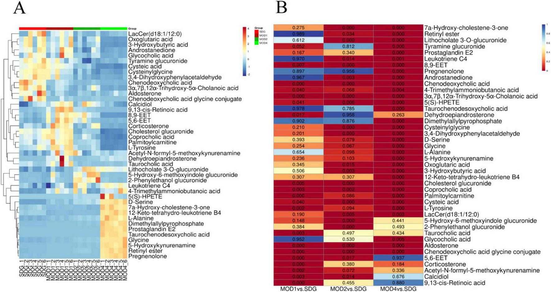 Differential metabolites abundance heatmap (A) and p-value heatmap (B) of RF.
