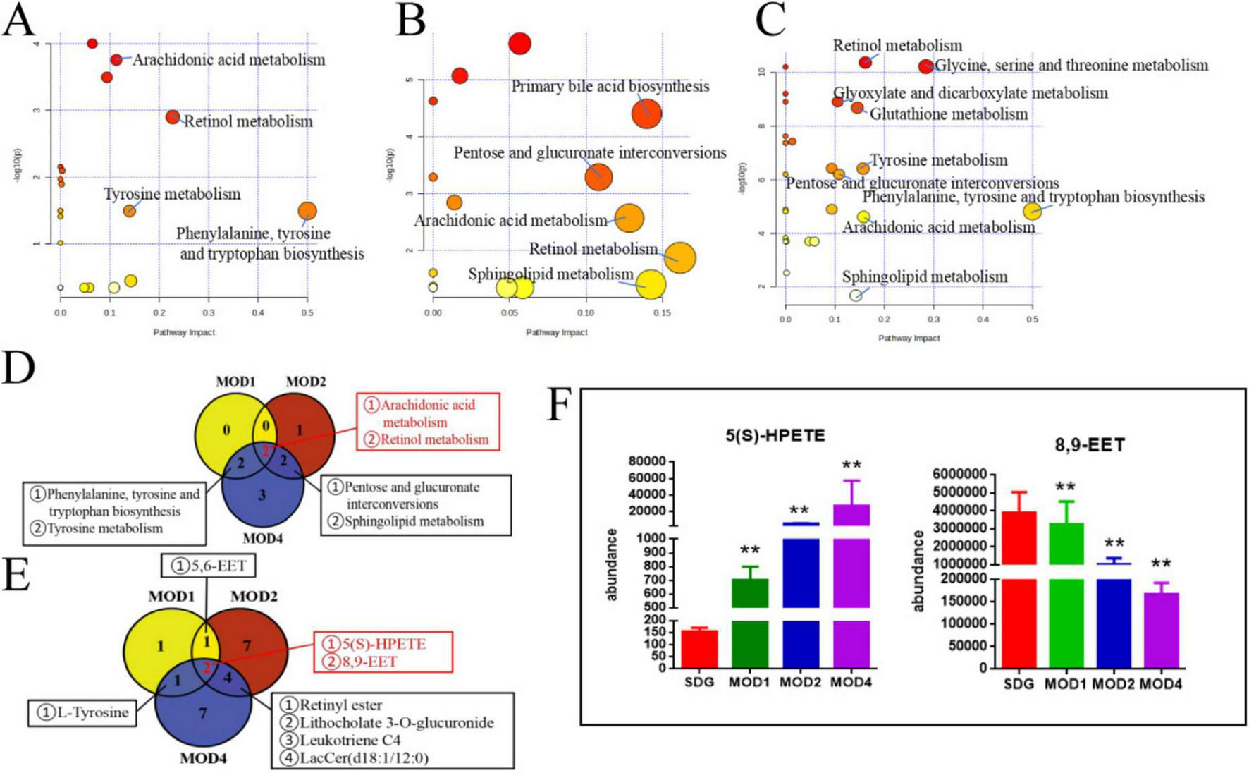 Critical metabolic pathways of RF: MOD1 (A), MOD2 (B), MOD4 (C); Venn diagram of critical metabolic pathways (D); Venn diagram of potential biomarkers in critical metabolic pathways (E); co-regulated metabolites at 1, 2, and 4 weeks of RF (F). **p < 0.01 vs. SDG group.