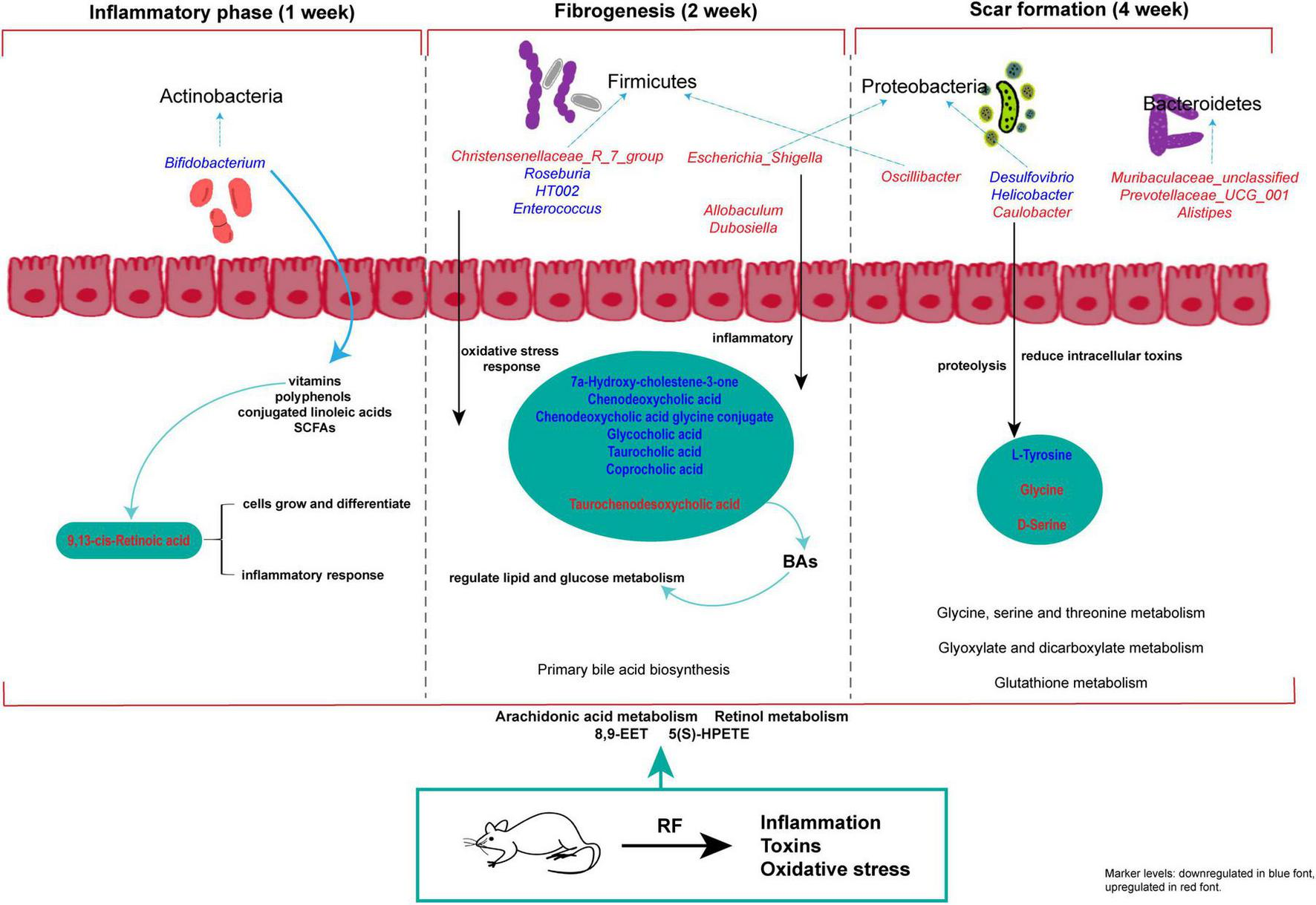 We employed UPLC-QTOF/MS metabolomics technology and 16S rDNA gut microbiota detection technology to identify the characteristic markers that impact disease progression. Our Study have observed the alterations in gut microbiota and serum metabolites across different stages of RF, demonstrating a significant correlation between them. RF is characterized by the accumulation of fibrotic tissue in the renal parenchyma, representing an excessive reparative response following kidney injury induced by various factors including trauma, infection, immune inflammation, and other insults. Fibrotic matrix deposition facilitates the reparative process during the early stages of RF progression and may undergo tissue remodeling following mild renal injury. Refractory fibrotic disease in its advanced stages is characterized by uncontrolled deposition of fibrotic matrix, structural damage to the kidneys, compromised blood supply, diminished organ function, and ultimately culminates in renal failure (34). In the pharmacodynamic analysis, the levels of serum ALB, BUN, Scr, and renal tissue SOD, MDA, HYP, (IL-6, IL-1β), Col-III, Col-IV, Colhe pharmacodynamic analysis, the levels of serum ALB, BUN, Scr, aent. SOD and MDA are indicative of oxidative reactions within the body (35, 36). The assessment of renal function commonly relies on the measurement of ALB, BUN, and Scr. ALB plays a crucial role in the inflammatory response (36), while BUN and Scr are metabolites that exhibit an inverse relationship with renal function levels (37). The increase in Scr levels primarily occurs during the middle and late stages of RF. Levels of HA, LN, Col-III The -IV Tand HYP are often positively correlated with the degree of fibrosis (38–41). At 1, 2, and 4 weeks of RF, significant increases were observed in levels of ALB, Col-IVo LN, HA, IL-6, and IL-1β (p < 0.01; p < 0.05). Additionally, at 2 and 4 weeks of RF, elevated levels were found for Col-IVo BUN, Scr, and HYP (p < 0.01; p < 0.05). However, the increase in MDA levels and decrease in SOD activity were observed at 4 weeks of RF progression (p < 0.01). The initial stages of RF exhibited alterations in cellular inflammation markers. Subsequent development of RF impaired renal excretory function, resulting in elevated levels of BUN and Scr, ultimately exacerbating RF through collagen fiber deposition and aggregation.