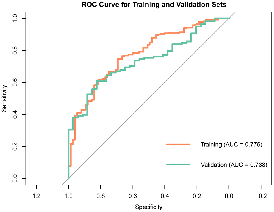 To maintain the study's objectivity, all patients were randomly allocated into a training set (70%, n = 355) and a validation set (30%, n = 152). The training set was utilized to build models using Multivariate logistic regression, LASSO regression, Random Forest, XGBoost, and SVM. The Multivariate logistic regression model identified three variables with P values < 0.05 among the 15 variables: Age, Glucose, and Phosphate (Table 2). The ROC curve of the Multivariate logistic regression model indicates that the AUC in the training set is 0.776, while in the validation set, it is 0.738 (Figure 2).
