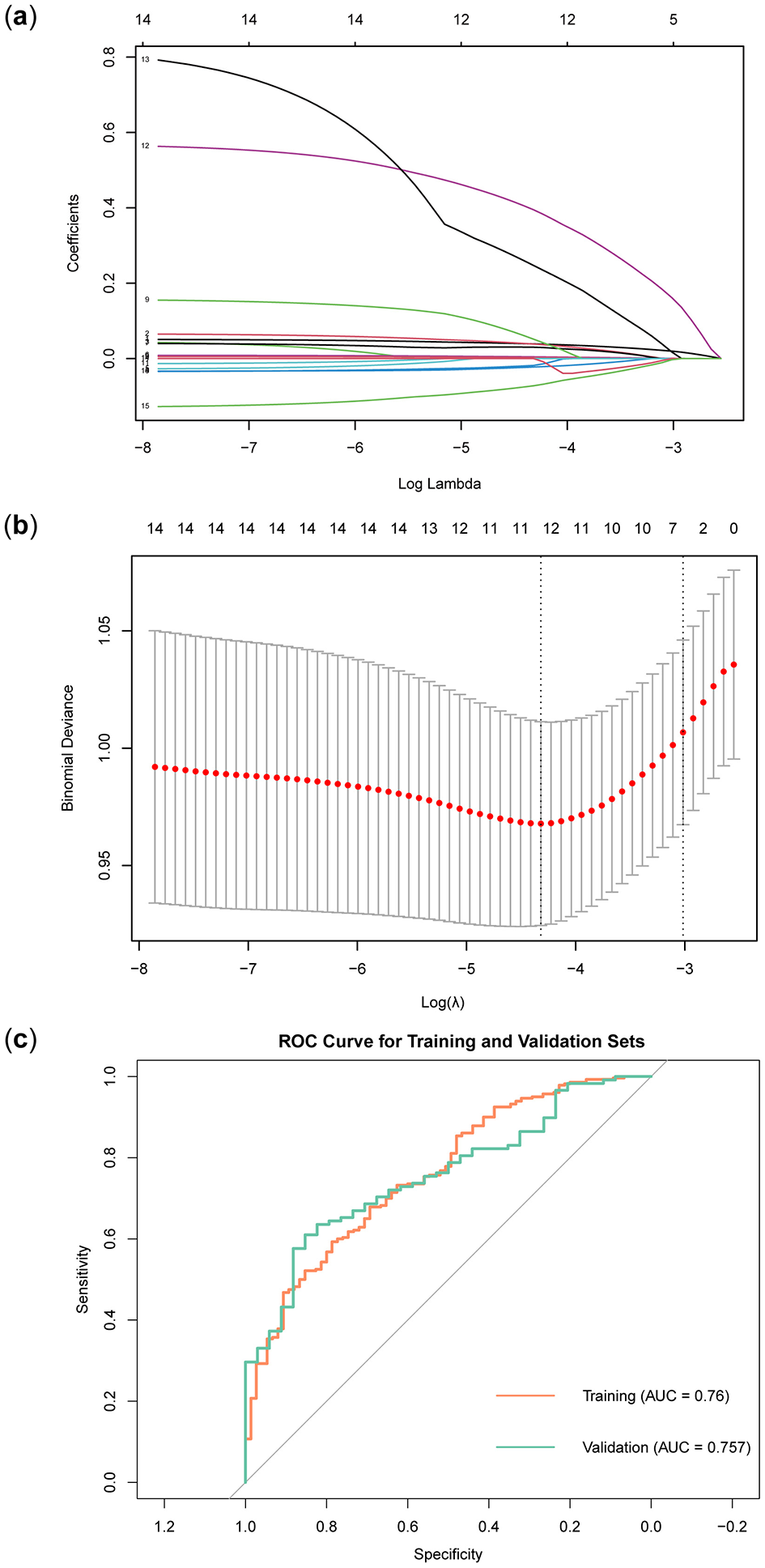 In the training set, the LASSO regression model tracks the path of coefficient changes with the regularization parameter λ (Figure 3A), and the optimal λ value is determined through 10-fold cross-validation (Figure 3B). The two vertical dashed lines represent the λ value corresponding to the minimum deviation within one standard error and the λ value that yields the simplest model with the fewest features. We selected the λ value corresponding to the minimum deviation (λ = 0.0133127), resulting in 11 feature variables (Table 3). The ROC curve of the LASSO regression model revealed that the AUC in the training set was 0.76, while in the validation set, it was 0.757 (Figure 3C).