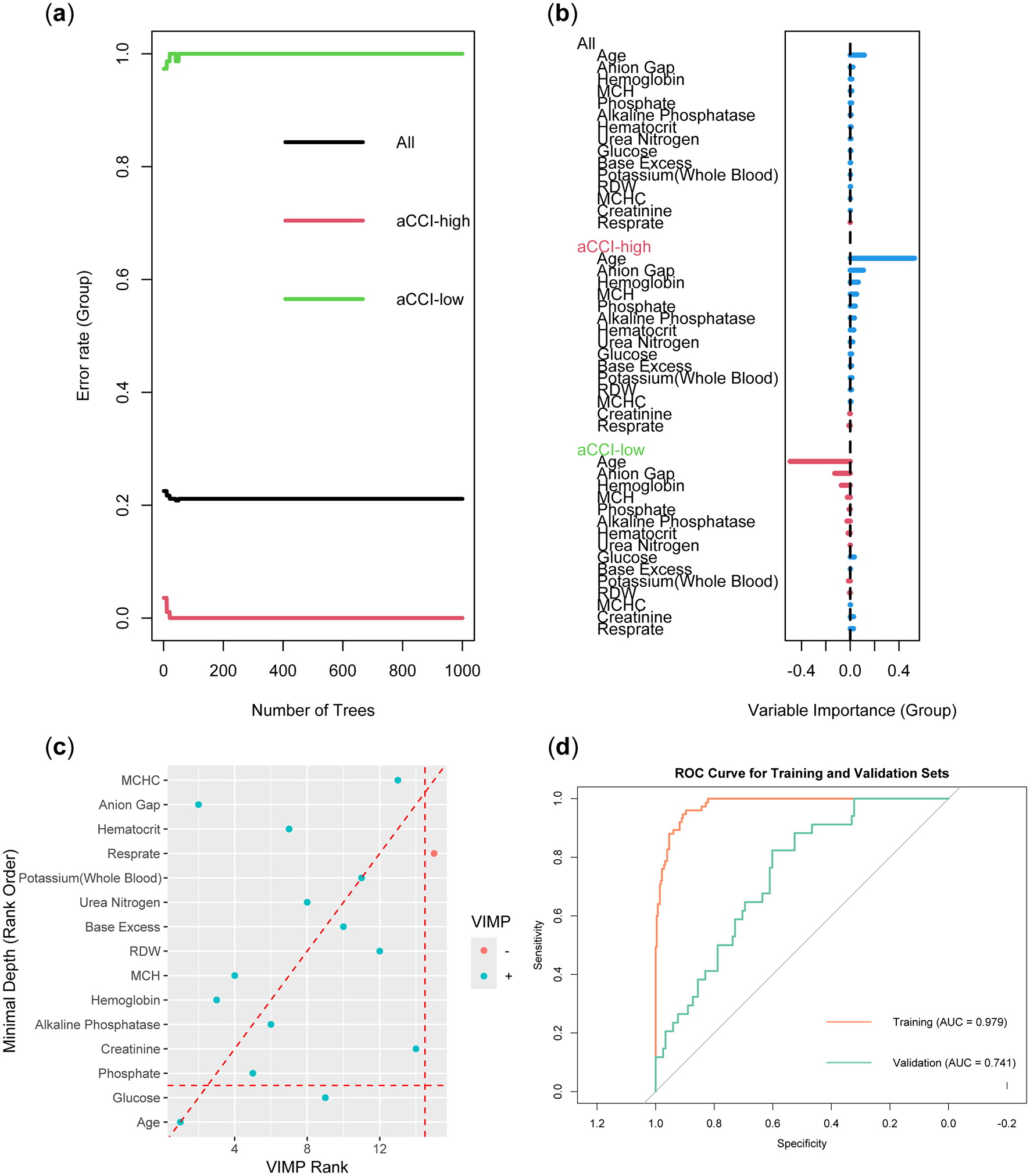 The Random Forest model was constructed using the training set data. To prevent overfitting, we set the number of trees to 100, the node size to 15, and employed sampling with replacement. Figure 4A demonstrated that as the number of trees increased, the error rate gradually decreased and stabilized. This indicated that the random forest model could achieve stable classification with a sufficient number of trees. Notably, the aCCI-high group exhibited the lowest error rate, suggesting that the model performed best in this group and was effective in identifying factors influencing the aCCI-high group. The importance of different variables in the Random Forest model was ranked according to their contribution to model prediction (Figure 4B). The colors distinguished the importance of variables between the aCCI-high and aCCI-low groups. We explored the relationship between minimum depth and variable importance (VIMP) to identify the variables that the model considered could be excluded. The results showed that Resprate was not considered important by the model (Figure 4C). In Figure 4D, the ROC curve of the Random Forest model showed that the AUC value for the training set was 0.979, while the AUC value for the validation set was 0.761.