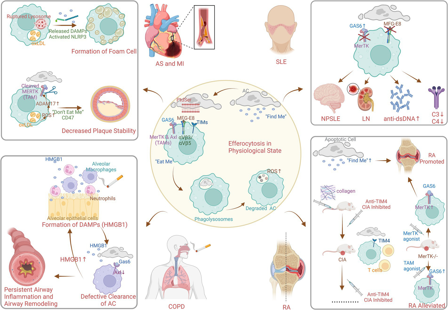 Mechanism of efferocytosis in physiological and pathophysiological state (created with BioRender.com). AC, apoptotic cell; PtdSer, phosphatedylserine; MFG-E8, milk fat globule EGF factor 8; GAS6, growth arrest specific protein 6; TIMs, T-cell immuneglobulin; MerTK, Mer protooncogene tyrosine kinase; Axl, anexelekto; TAMs, Tyro3/Axl/Mer receptor tyrosine kinases; ROS, reactive oxidative stress; DAMPs, damage-associated molecular patterns; NLRP3, nucleotide-binding oligomerization domain-like receptor protein 3; oxLDL, oxidized low-density lipoprotein; AS, atherosclerosis; MI, myocardial infarction; HMGB1, high mobility group box 1 protein; COPD, chronic obstructive pulmonary disease; SLE, systemic lupus erythematosus; NPSLE, neuropsychiatric systemic lupus erythematosus; LN, lunpus nephritis; RA, rheumatoid arthritis; CIA, collagen-induced arthritis.