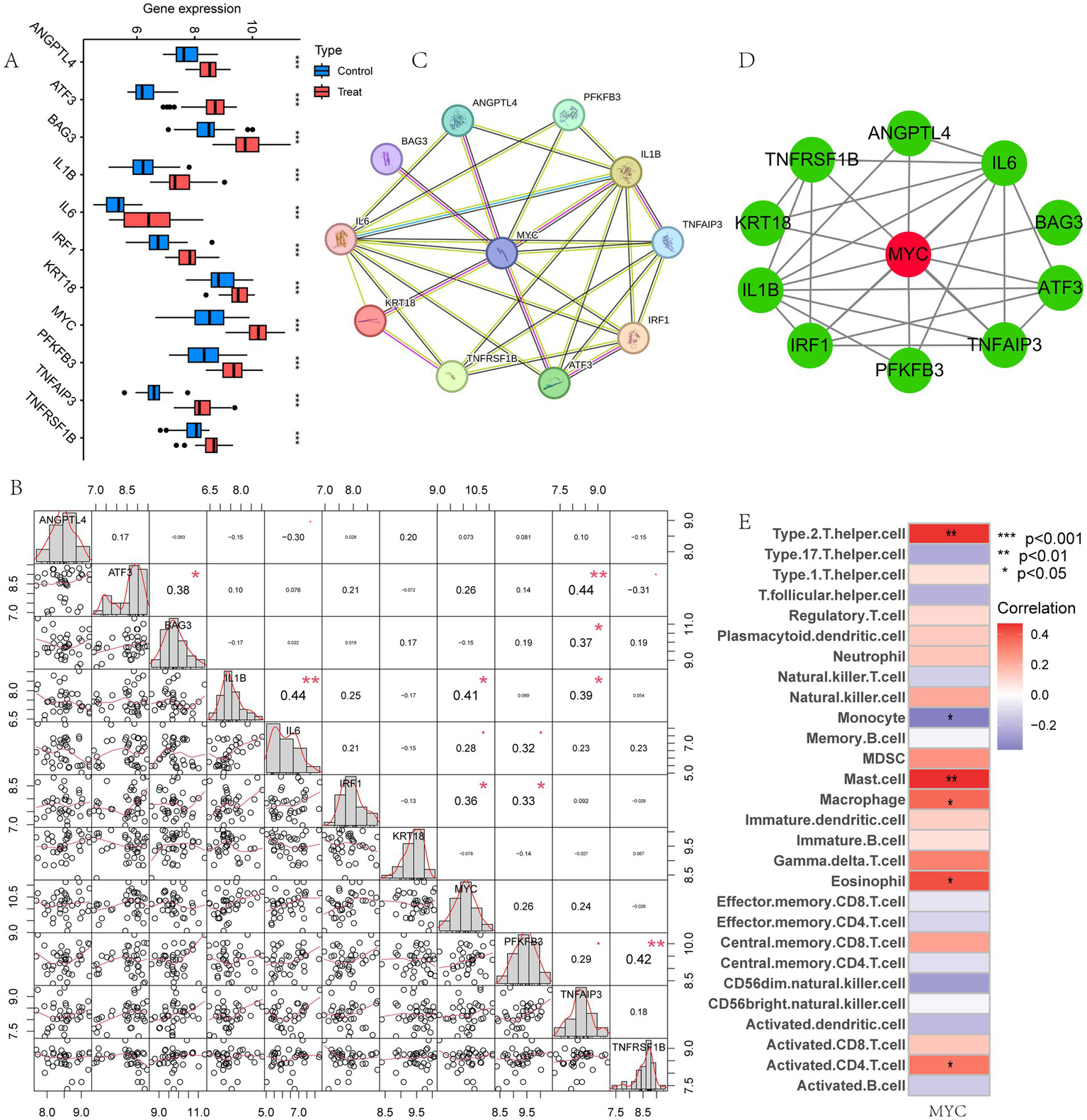 Identification of the hub gene. (A) Box plot showed the expression difference of model genes between LIRI and control samples in training set. (B) Correlation analysis of 11 model genes; (C) PPI of the model genes; (D) The hub gene MYC was identified from 11 genes using Cytoscape; (E) Immune cell correlation analysis of MYC.