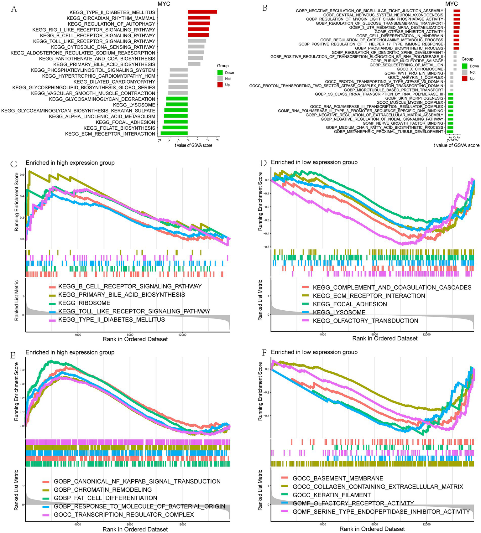 Functional enrichment analysis of MYC in LIRI. (A,B) Enrichment biological functions and pathways of MYC identified by GSVA; (C–F) Enrichment biological functions and pathways of MYC identified by GSEA.
