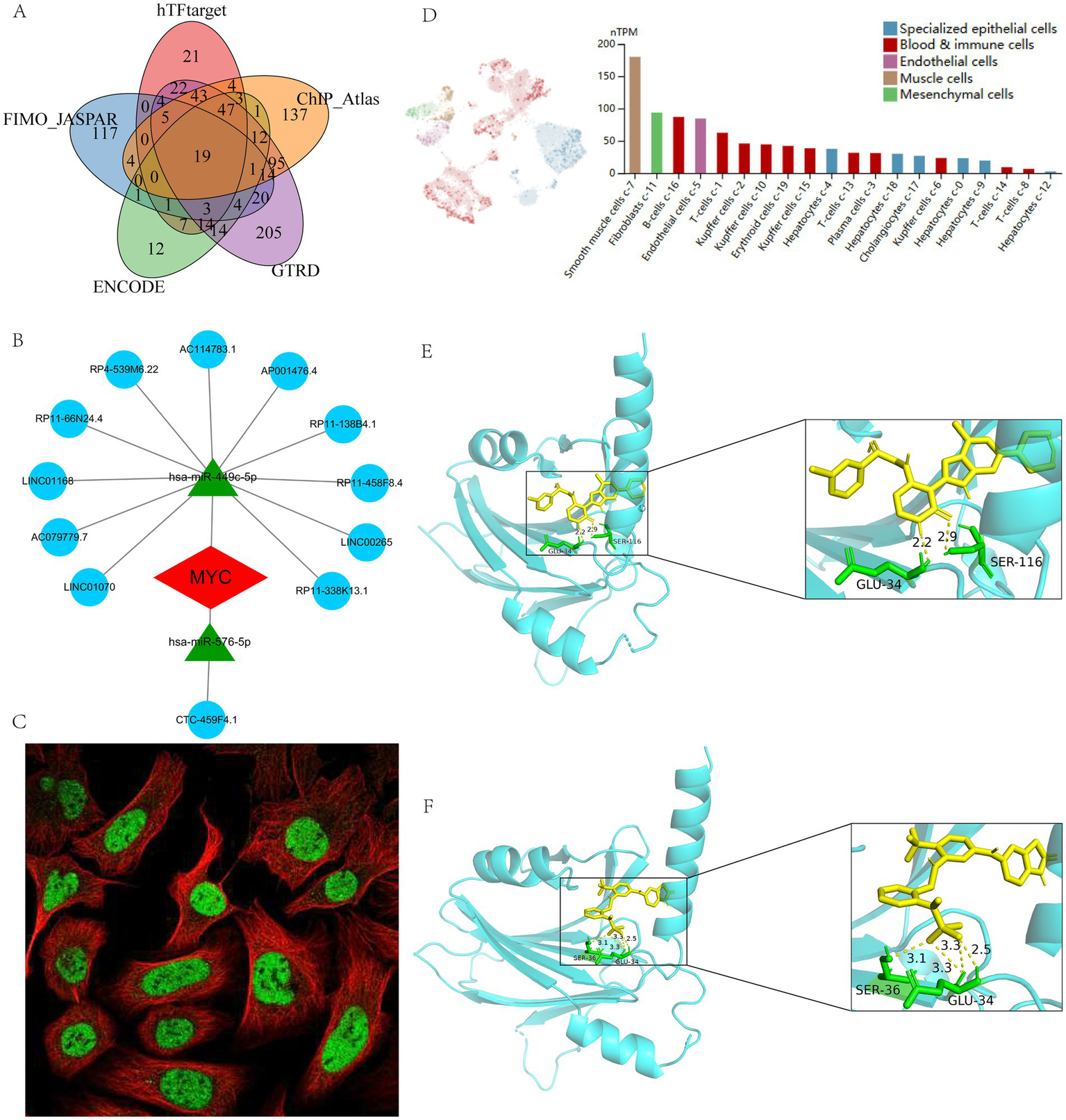 Regulatory network, single-cell mapping and immunofluorescence analysis of MYC. (A) Prediction of TFs based on different databases; (B) The ceRNA network of MYC; (C) The immunofluorescence of MYC based on HPA database; (D) The single-cell mapping of MYC based on HPA database; (E) Molecular docking of BMS-536924 and MYC; (F) Molecular docking of PF-431396 and MYC.