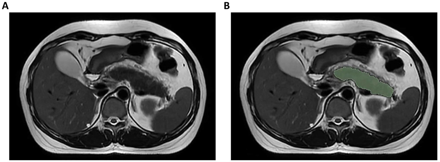 Illustration of axial T2-weighted MRI image segmentation. (A) Original image; (B) Delineation of region of interest.