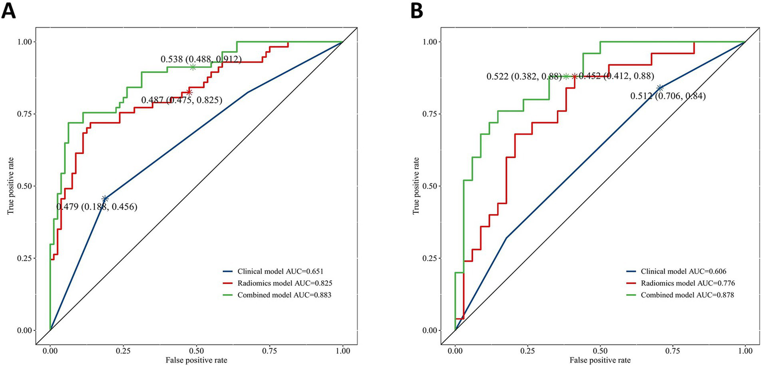 AUC of 0.883 (95% CI: 0.826–0.94), accuracy of 0.825, specificity of 0.875, and sensitivity of 0.754 were found in the combined model in the training group; AUC of 0.825 (95% CI: 0.752–0.897), accuracy of 0.766, specificity of 0.8, and sensitivity of 0.719 were found in the radiomics model; and AUC of 0.651 (95% CI: 0.562–0.74), accuracy of 0.664, specificity of 0.812, and sensitivity of 0.456 were found in the clinical model. In the test group, the combined model produced an AUC of 0.878 (95% CI: 0.791–0.964), the accuracy of 0.814, specificity of 0.882, and sensitivity of 0.72; and an AUC of 0.776 (95% CI: 0.656–0.897), the accuracy of 0.712, specificity of 0.794, and sensitivity of 0.6 for the radiomics model; and an AUC of 0.606 (95% CI: 0.472–0.74), the accuracy of 0.61, specificity of 0.824, and sensitivity of 0.32 for the clinical model (Table 2).