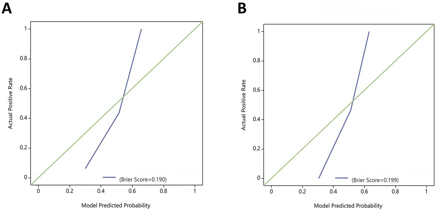 Calibration curves for the combined model in the training and test sets. (A) Training set; (B) Test set.