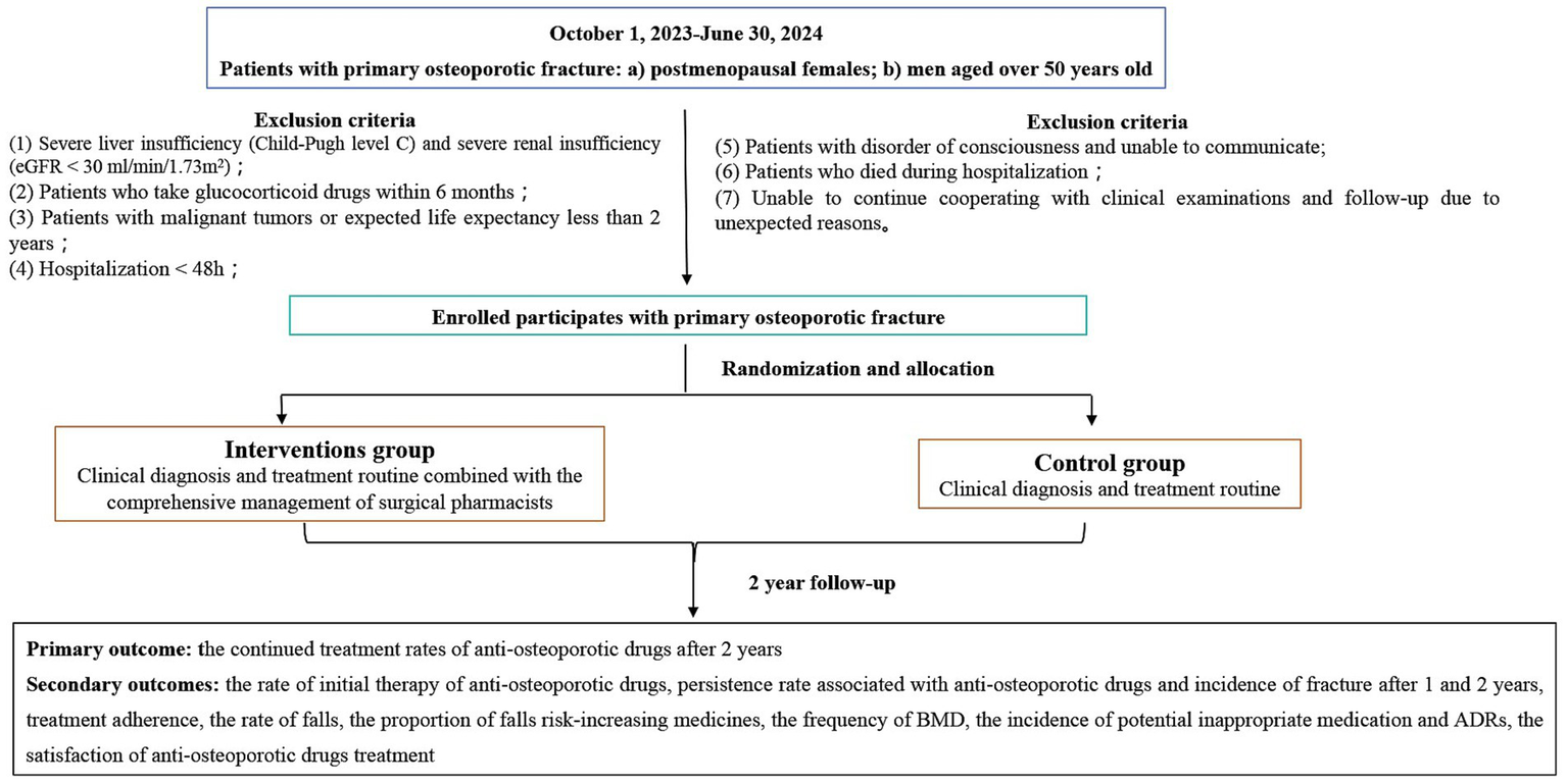 This study is a single-center, prospective, and randomized controlled trial. The targeted participants in this protocol were patients aged above 50 years who had been diagnosed with osteoporotic fractures in China. Eligible participants were randomized into intervention and control groups in a 1:1 ratio using a dynamic stratified block randomization method. The control group received standard care, and the intervention group received standard care combined with pharmacist-led care. The intervention group received comprehensive pharmacist-led interventions, including pharmaceutical ward rounds and medication reconciliation, refracture risk evaluation, recommendations to physicians, patient education, and counseling. A 2-year follow-up was conducted to evaluate the outcomes between groups through telephone interviews, pharmaceutical clinics, and e-hospital pharmacy practice. The primary outcome is the ongoing treatment rates of anti-osteoporotic drugs. The treatment rates are defined as the ratio of patients who remain on anti-osteoporotic medications at each follow-up visit to the total number of enrolled participants. Secondary outcomes include treatment initiation rates, medication adherence, re-fractures, and use of drugs that increase fall risk, the frequency of bone mineral density (BMD) assessments, the incidence of inappropriate medication use, adverse drug reactions (ADRs), and patient satisfaction with osteoporotic fracture treatment. Refracture rates were evaluated through a 2-year follow-up, while BMD were measured at baseline, 1 year, and 2 years using dual-energy X-ray absorptiometry (DXA). ADRs and the inappropriate use of medication were monitored through self-reports and medication reconciliation. Patient satisfaction were assessed using the Treatment Satisfaction Questionnaire for Medication version II (TSQM-II). Ethical approval was obtained from the Committee of Ethics of the First Affiliated Hospital of Shantou University Medical College (approval number: B-2023-194). The statistical analysis was performed using Statistics Package for the Social Science (SPSS), version 23.0.