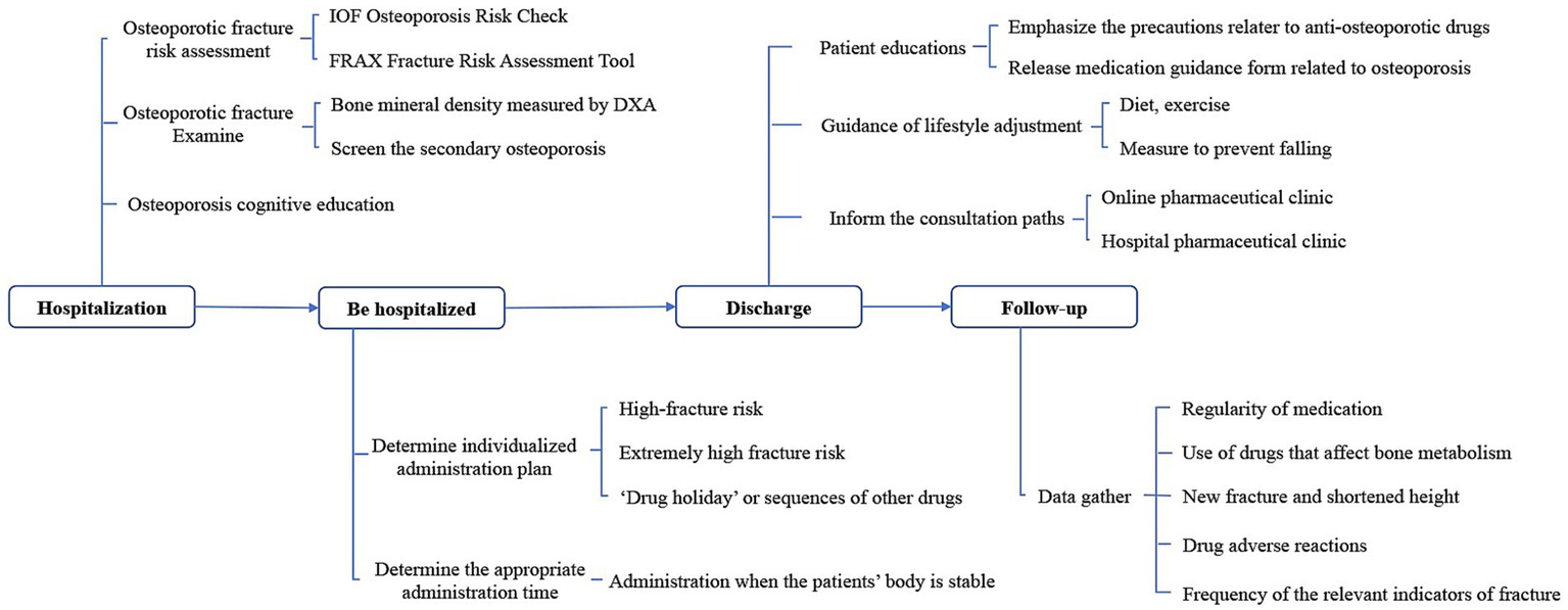 First, the surgical pharmacist uses the Fracture Risk Assessment Tool (FRAX) to evaluate the risk of fracture. Second, the individualized therapeutic options for osteoporosis are formulated under the guidance of the Clinical Pathway of anti-osteoporotic drugs of patients with osteoporosis formulated by surgical pharmacists and orthopedists. Third, all participants will be educated by surgical pharmacists, including the usage of anti-osteoporotic drugs, the importance of persisting with osteoporosis medication, maintaining physical activity, and prevention of falling. Furthermore, patients will be provided a brochure on preventing fractures to enhance the consciousness of osteoporotic fractures.