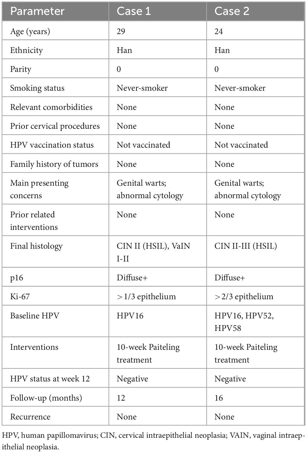 Non-surgical strategies—including photodynamic therapy, immunomodulatory agents, and Traditional Chinese Medicine (TCM)—are attracting interest for their potential to avoid cervical tissue loss (10, 16–18). Among TCM approaches, external therapies such as fumigation, rubbing, and soaking with plant-derived preparations have been reported to achieve local viral clearance without the tissue damage associated with surgery (16, 17). Paiteling, a pure TCM formulation, has shown encouraging results in treating HPV infection and condyloma acuminatum (17, 19–21), yet its role in managing high-grade CIN remains unexplored. Here, we present a retrospective review of two cases of reproductive-age women with biopsy-confirmed HSIL and concomitant vaginal and cervical condyloma acuminatum, successfully managed with topical Paiteling.