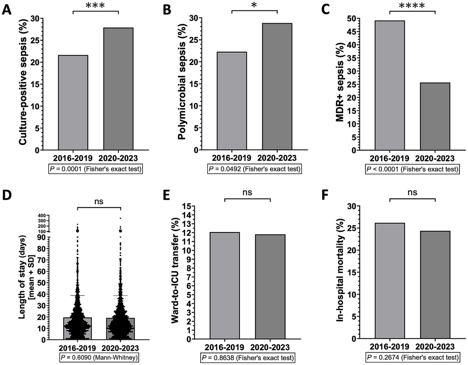 A total of 4,375 patients were recruited. Median length of stay (LOS) was 14 days, and mean ward-to-intensive care unit (ICU) transfer and in-hospital mortality rates were 11 and 26%, respectively; significant differences were observed over the years, with LOS peaks preceding mortality peaks by 1 year. Blood culture-negative sepses showed shorter stays and higher mortality (acute kidney injury and fast deterioration) compared to culture-positive ones; polymicrobial sepses showed higher ICU transfer rates (acute respiratory distress); while multidrug-resistant (MDR+) and/or polymicrobial sepses showed longer stays and higher mortality (complicated course) compared to drug-sensitive or monomicrobial ones. C-reactive protein elevation predicted rapidly evolving culture-negative sepsis, whereas lower leukocyte counts predicted prolonged hospitalization; higher fractions of inspired oxygen predicted polymicrobial sepsis, while lactate elevation predicted ICU transfer; ferritin elevation and increased leukocyte counts predicted MDR+ sepsis, while further ferritin elevation and decreased platelet counts predicted death. From 2016 to 2023, MDR+ sepsis frequency declined, due to decreased resistance to several antibiotic classes, such as cephalosporins, fluoroquinolones, and aminoglycosides; however, carbapenemase- and extended-spectrum beta-lactamase-producing Gram-negative bacteria, as well as vancomycin-resistant enterococci, increased, as did the frequency of polymicrobial sepsis following the COVID-19 outbreak.