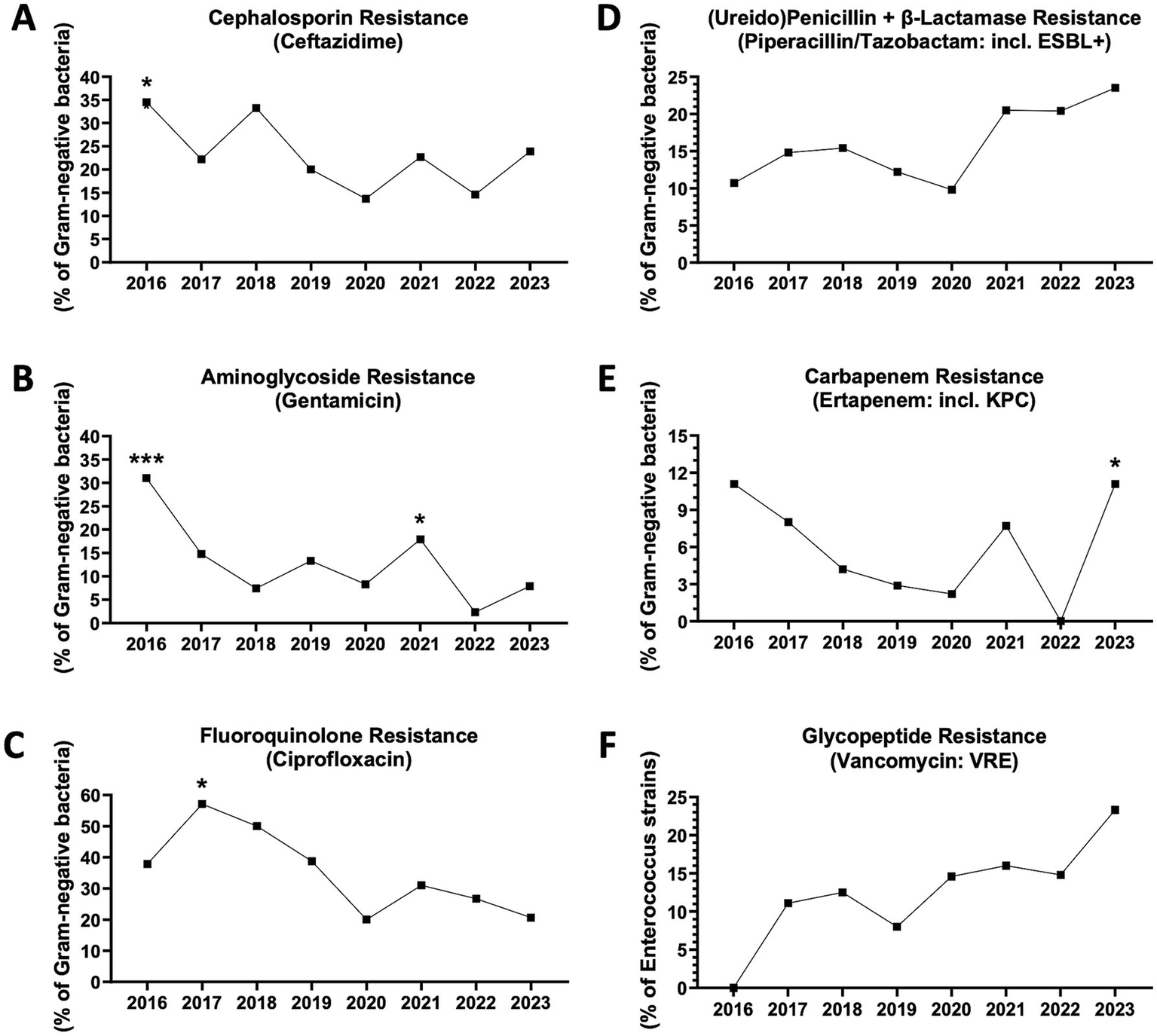 Hospital outcomes for sepsis in medical wards between 2012 and 2023 (n = 4,375 patients). (A) Length of stay (LOS). **From 2012 to 2023, p = 0.0017 (Kruskal–Wallis test). ***2015 vs. 2012, p = 0.0001. *2015 vs. 2022, p = 0.0449. **2017 vs. 2012, p = 0.0044. **2021 vs. 2012, p = 0.0021 (Dunn’s multiple comparisons). (B) Ward-to-ICU transfer. **From 2012 to 2023, p = 0.0423 (chi-square). ***2016 vs. 2013, p = 0.0003. **2016 vs. 2019, p = 0.0010. **2016 vs. 2014, p = 0.0048. *2016 vs. 2012, p = 0.0168. *2016 vs. 2020, p = 0.0239. *2016 vs. 2015, p = 0.0257. *2016 vs. 2021, p = 0.0293. *2016 vs. 2023, p = 0.0471. *2016 vs. 2018, p = 0.0491. *2022 vs. 2013, p = 0.0254 (Fisher’s exact test). (C) In-hospital mortality. **From 2012 to 2023, p = 0.0031 (chi-square). ***2016 vs. 2019, p = 0.0009. **2016 vs. 2021, p = 0.0031. **2016 vs. 2023, p = 0.0071. *2016 vs. 2017, p = 0.0249. **2018 vs. 2019, p = 0.0030. *2018 vs. 2021, p = 0.0101. *2018 vs. 2023, p = 0.0252. **2013 vs. 2019, p = 0.0038. *2013 vs. 2021, p = 0.0111. *2013 vs. 2023, p = 0.0257. **2012 vs. 2019, p = 0.0050. *2012 vs. 2021, p = 0.0116. *2012 vs. 2023, p = 0.0323. *2022 vs. 2019, p = 0.0239. *2022 vs. 2021, p = 0.0453 (Fisher’s exact test).