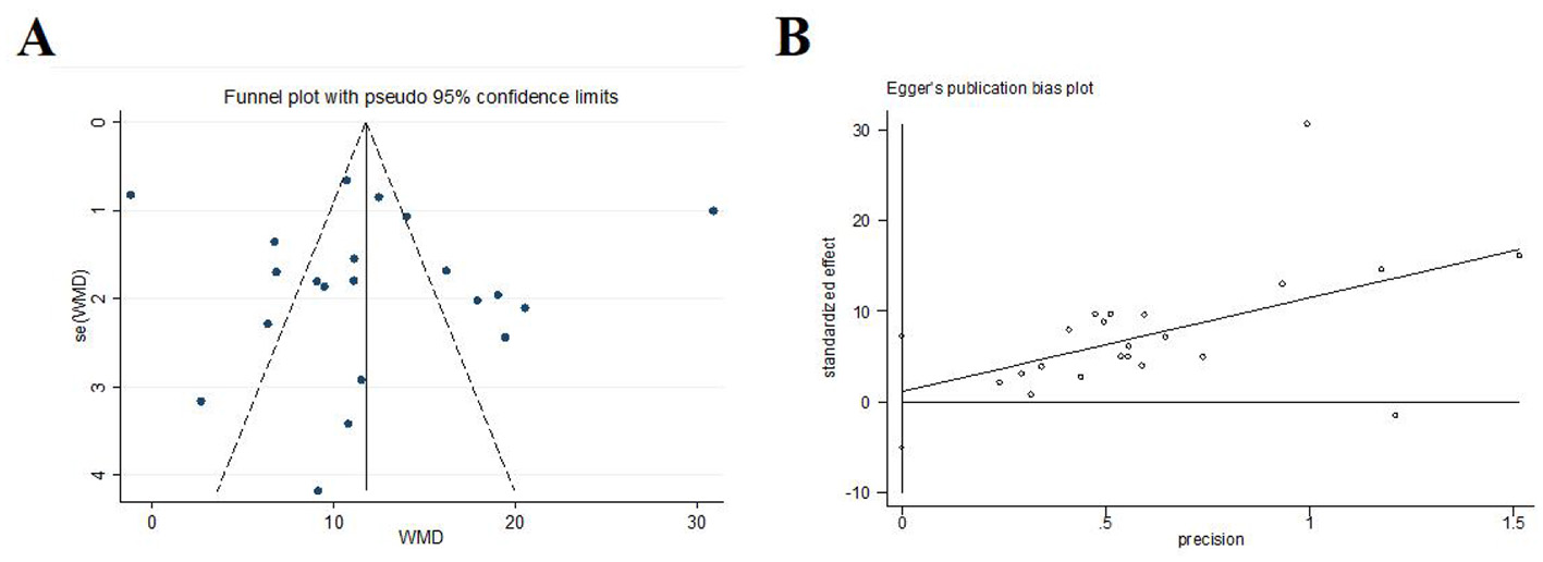 All statistical analyses were performed with STATA Software, version 11.0. We used a random-effects model (DerSimonian and Laird method) to calculate summary effect estimates for primary and secondary outcomes. Heterogeneity was assessed by the χ2 test and the I2 statistic. Dichotomous outcomes were expressed as the risk ratio (RR) with a 95% confidence interval (CI), while continuous outcomes were expressed as the standardized mean difference (MD) with a 95% CI. Standardized mean difference (SMD) was selected when different measures and units were used, or when the difference in means between studies was too large. A funnel plot and Egger's test were applied to evaluate publication bias when the number of included studies was more than 10. A subgroup analysis and a meta-regression were conducted based on the interventions, comparisons, type of disease, course of disease and course of treatment. Sensitivity analysis was conducted to evaluated the stability of the results.