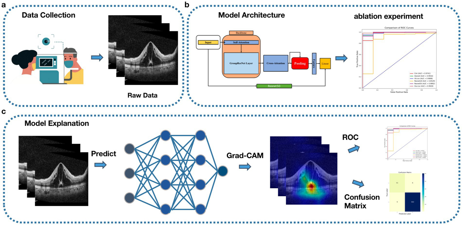 Workflow, (A) Data acquisition, collecting patient OCT data. (B) Model construction and testing. (C) Model visualization.